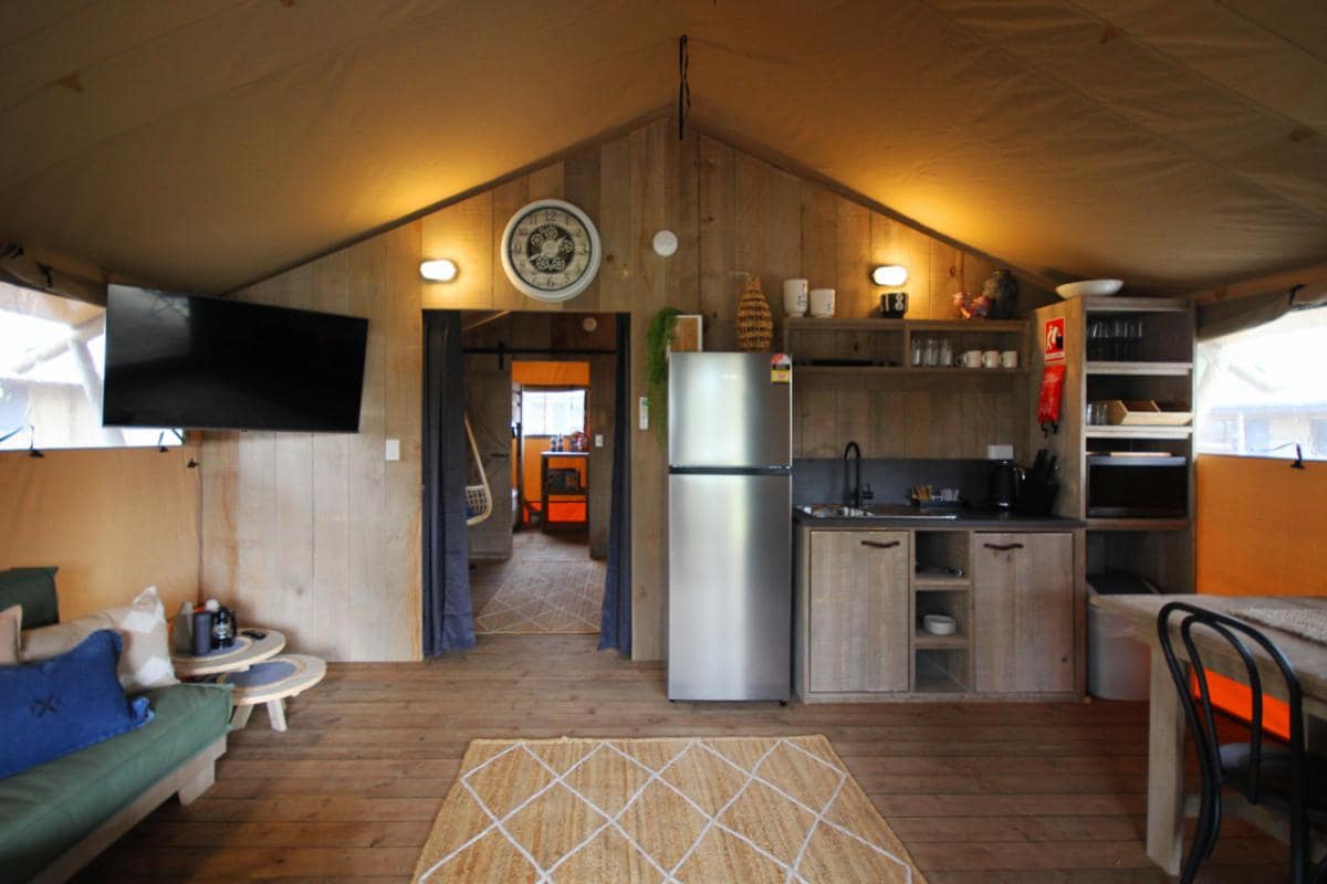 Nyd den perfekte blanding af natur og komfort i vores luksuriøse safaritelte. Disse rummelige trærammetelte er designet med familier i tankerne og kan rumme op til seks gæster med en queensize-dobbeltseng og to køjesenge. Hygge dig året rundt med aircondition og varme, og føl dig hjemme med et moderne badeværelse og fuldt udstyret tekøkken – herunder et køleskab i fuld størrelse, mikrobølgeovn og te- og kaffefaciliteter. Der tilbydes også et fuldt privat grillområde udenfor, som du kan nyde sammen med dit safaritelt.