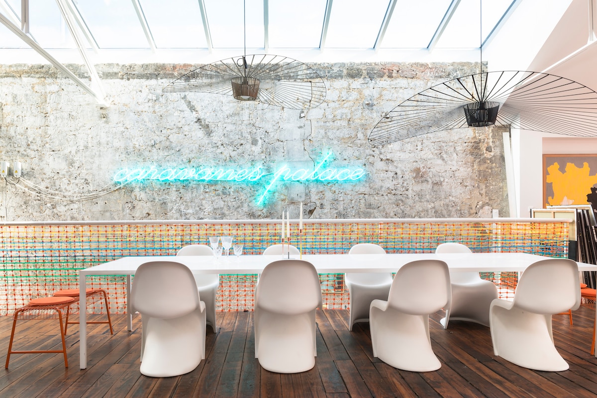 Stor loftslejlighed en ledig plads i stueetagen med 4 soveværelser i campingvognen, 2 badeværelser, to toiletter og et vaskerum. Plads med udsigt over en have + boulodrome. Ovenpå er der en stor køkkenstue med en baldakin sporvogn c ( direkte messe - stadion ) 50 meter