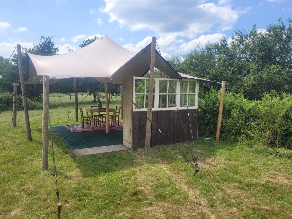 Vi byder dig velkommen i en udendørs hytte. Den er designet med komfort, holdbarhed og glad enkelhed i tankerne. Midt i naturen, under beskyttelse af et hundrede år gammelt mesteregetræ, vil du i al privatlivets fred nyde pladsen og stilheden. Marked ved Garonne, vandreture, loppemarkeder, landsbyfestivaler, opdagelse af biavl, smagning af grøntsager, dagdrømmer ved søen, alt er muligt... Vi vil med glæde dele vores kærlighed til dette sted med dig.