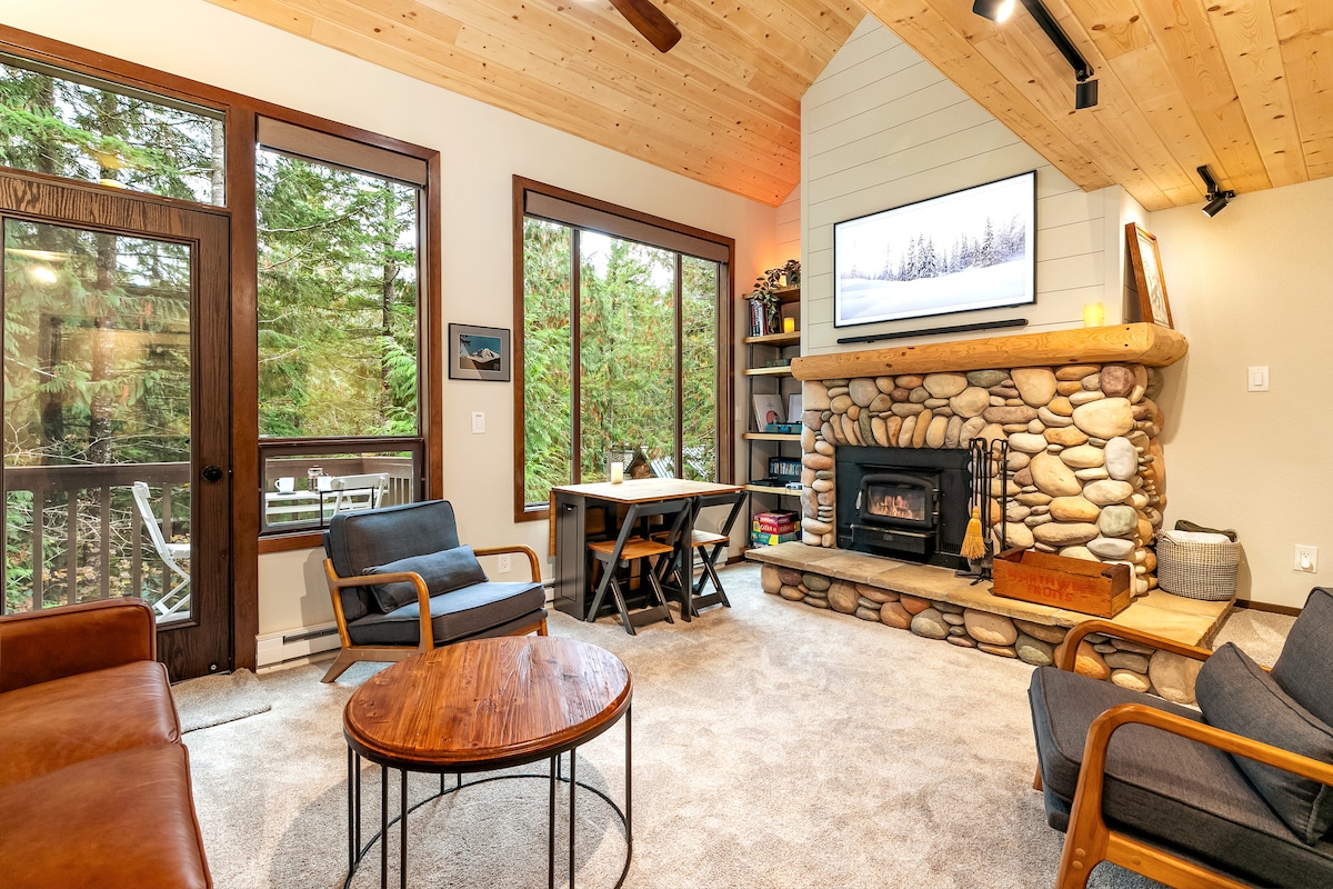 Lagom: Svensk for "ikke for lidt, ikke for meget"... denne hytte er lige i øjet. Lagom-hytten kombinerer hyggelige PNW-hyttevibes med skandinavisk enkelhed (herunder en pejs direkte fra Norge!) Nyligt renoveret og hundevenlig. Stort åbent opholdsområde og dedikeret kontor (arbejd om morgenen og stå på ski om eftermiddagen!) Beliggende i det rolige, lukkede Glacier Rim-samfund, så tæt som du kan komme på Mt. Baker Ski Area. Gemt væk i træerne, så du næsten ikke ville vide, at det var der.