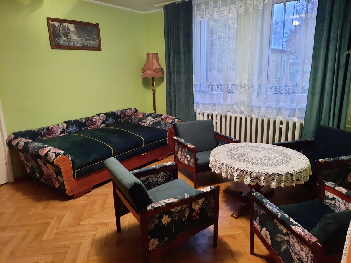 Stemningsfuld lejlighed på 63m2, på torvet, i nærheden af alle historiske bygninger. Et par skridt fra restauranter, vigtige faciliteter og attraktioner. Lejligheden har: et soveværelse med en seng 160cmx200cm, et skrivebord/toilet og et tre-dørs skab; en stue med en foldbar sofa (soveplads ca. 140cmx220cm), en foldbar enkeltsofa (soveplads 104cmx190cm), et tre-dørs skab, en kommode og et smart TV, et badeværelse med bruser og vaskemaskine, et køkken med fuldt udstyr.