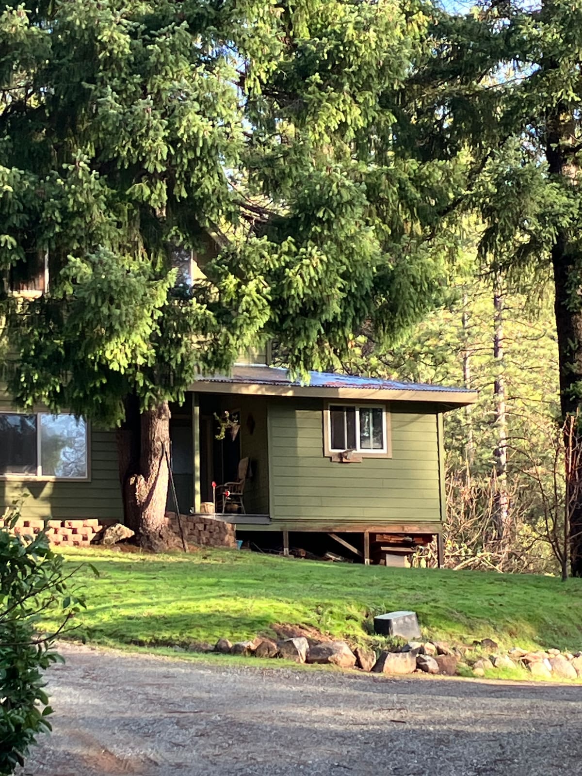 Dette er et privat gæstehus, der støder op til ejerens hjem. Det ligger ved siden af smukke 100 fods cedertræer, kornel og fyrretræer på 2 skovklædte hektar. Dette 400 kvadratmeter store gæstehus har et komplet køkken, stue med hvælvet loft, badeværelse med brusebad, et soveværelse med en queensize-dobbeltseng. Soveværelset har egen indgang til den store terrasse. Der er et loft, der kan rumme yderligere gæster. Beliggende kun 3 1/2 miles fra downtown Grass Valley og 5 miles fra Nevada City, CA.