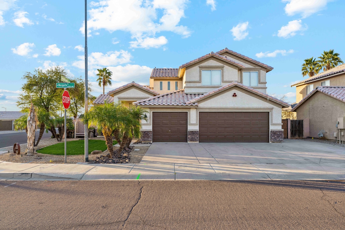 Newly built ranch style home is situated on a quiet circle with views of the Estrella Mountains. This home is beautifully landscaped and it has a private pool (heated for an extra fee) and a separate heated spa. There are 4 bedrooms, 4 bathrooms and 2,300 square feet in all. There are 2 master suites, a 3rd bedroom, a casita with it’s own entrance and 1 large main open living area which is great for entertaining. Close to shopping, hiking, baseball fields, movie theaters and most amenities.