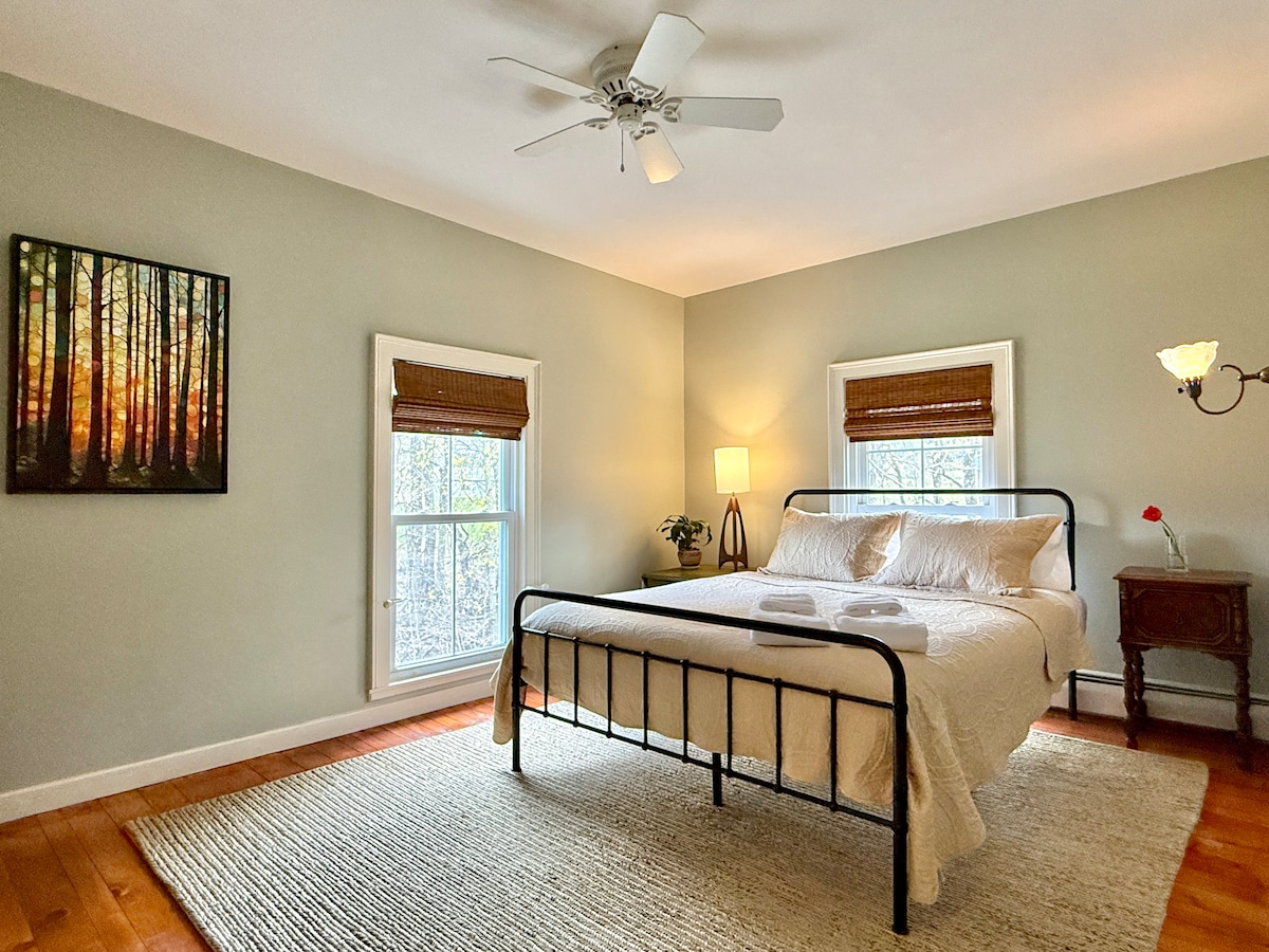 The Lily Pad is a comfy one room king bed cottage with a porch overlooking the pond. A private full bath is 30 steps away (attached to our home for plumbing purposes, but you have a private entry). The paved path is well lit. The cottage is insulated, heated,air conditioned, has electricity,Wi-Fi, and a smart tv to be used w/ your own accounts. Fishing pole provided. The cottage is separated from our home by a garage. We leave guests uninterrupted unless they want to interact or need anything.