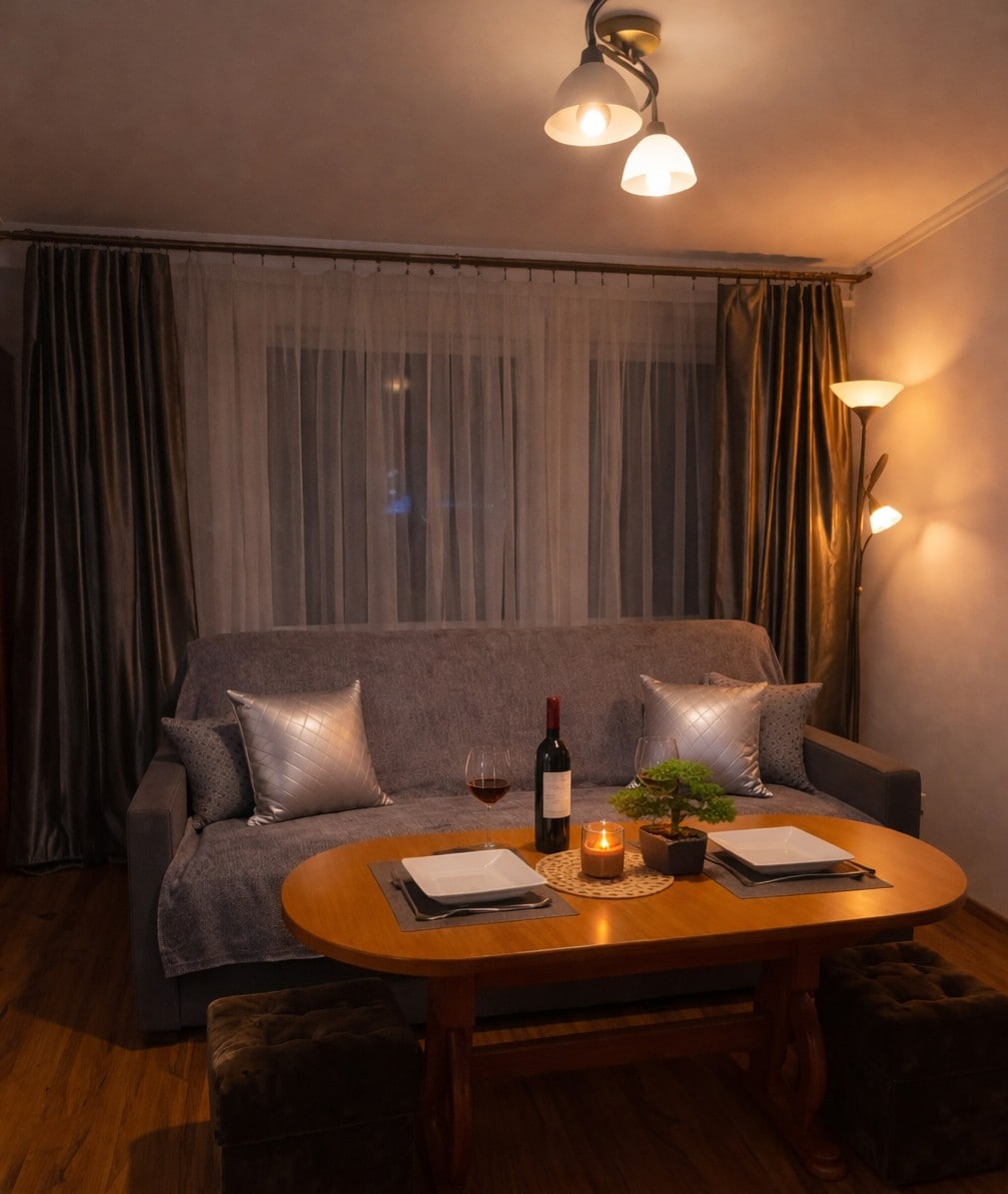 Vi har skabt et sted, hvor vi selv gerne vil bo. Der er komfortable senge og blødt ubleget bomuldssengetøj med et diskret print af vilde blomster. Vi har lavet en masse møbler selv, fordi vi kan lide originale ting. Vi elsker også kaffe, så der er en trykkaffemaskine, men dem, der foretrækker en uerstattelig, traditionel kaffemaskine eller filterkaffe, finder alt, hvad de har brug for her, herunder et bredt udvalg af kaffe. Vi sørgede også for en førstehjælpskasse og et sæt basale hygiejneprodukter.