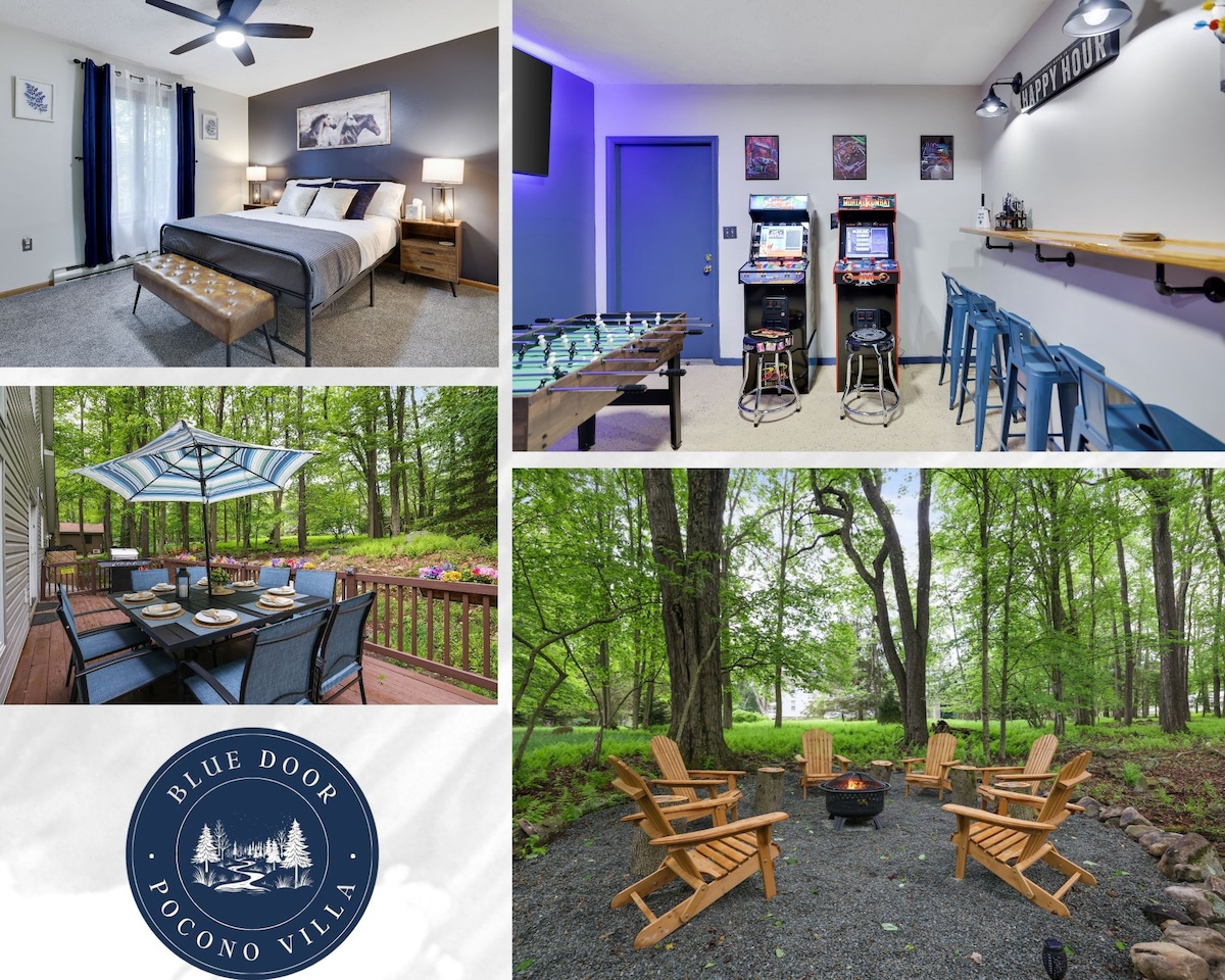Tag på en hyggelig efterårsferie i nærheden af Kalahari, Mount Airy Casino, Crossings Outlets, Lake Wallenpaupack og Tobyhanna State Park 3 km væk med efterårsblade, bjergluft, søudsigt, dyreliv og picnicsteder. Beliggende ved en ujævn privat vej. Denne spa-lignende oase har et badekar, regnbruser, smart belysning, køkken med smart komfur, bløde senge, LED-spejle med musik og retro arkadespil. Perfekt til par, fødselsdagsferier eller familier, der søger et fredeligt Poconos-ophold med moderne faciliteter.