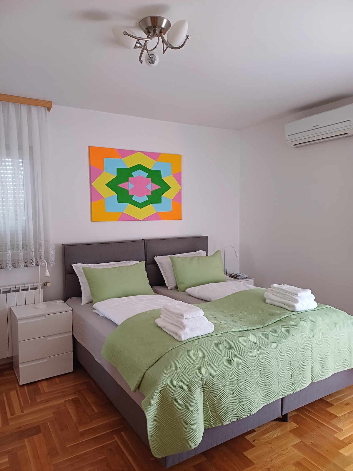 Airport M.A.M. ligger i Velika Gorica, 4,5 km fra Zagrebs lufthavn, 1,2 km fra fodboldstadionet Velika Gorica, 15 km fra Zagrebs centrum. Den hurtigste måde at komme til lejligheden er med en Bolt- eller Uber-taxi eller med buslinje 290. Der er hurtigbus 268 til Zagrebs centrum. Bygningen har to enheder, en lejlighed og et værelse. Hver enhed har et separat badeværelse, balkon og opholdsområde. Håndklæder, toiletpapir, sæbe ... Der er gratis parkering til din bil
