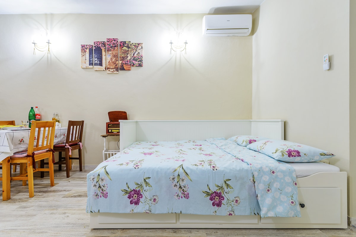 En cca 30 m2 unik gæstehus/taverna ved siden af vores lejlighedsvilla. Fritliggende fra selve villaen, med en indendørs pejs, aircondition, køkken, en sofa, der foldes ud til en seng til 2 personer (+ 1 ekstra seng om nødvendigt), et spisebord og et lille badeværelse. Der er også et bord/stole foran gæstehuset, der fungerer som en lille terrasse i haven!