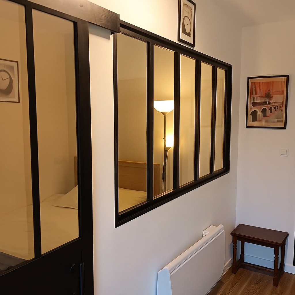 Atypisk lejlighed på 44m2 på første sal i et hus i en meget stille blindgyde. Funktionel bolig til 4 personer, til ferie eller forretning. Vi leverer sengetøj og håndklæder. Stor og meget lys stue (stor volumen, åbninger mod øst-vest) og åbent køkken. Stort soveværelse med skrånende loft og garderobeskab. Badeværelse med toilet og brusebad 90x90. Vaskerum til ekstra opbevaring. En privat have til din rådighed. Gratis parkering på gaden.