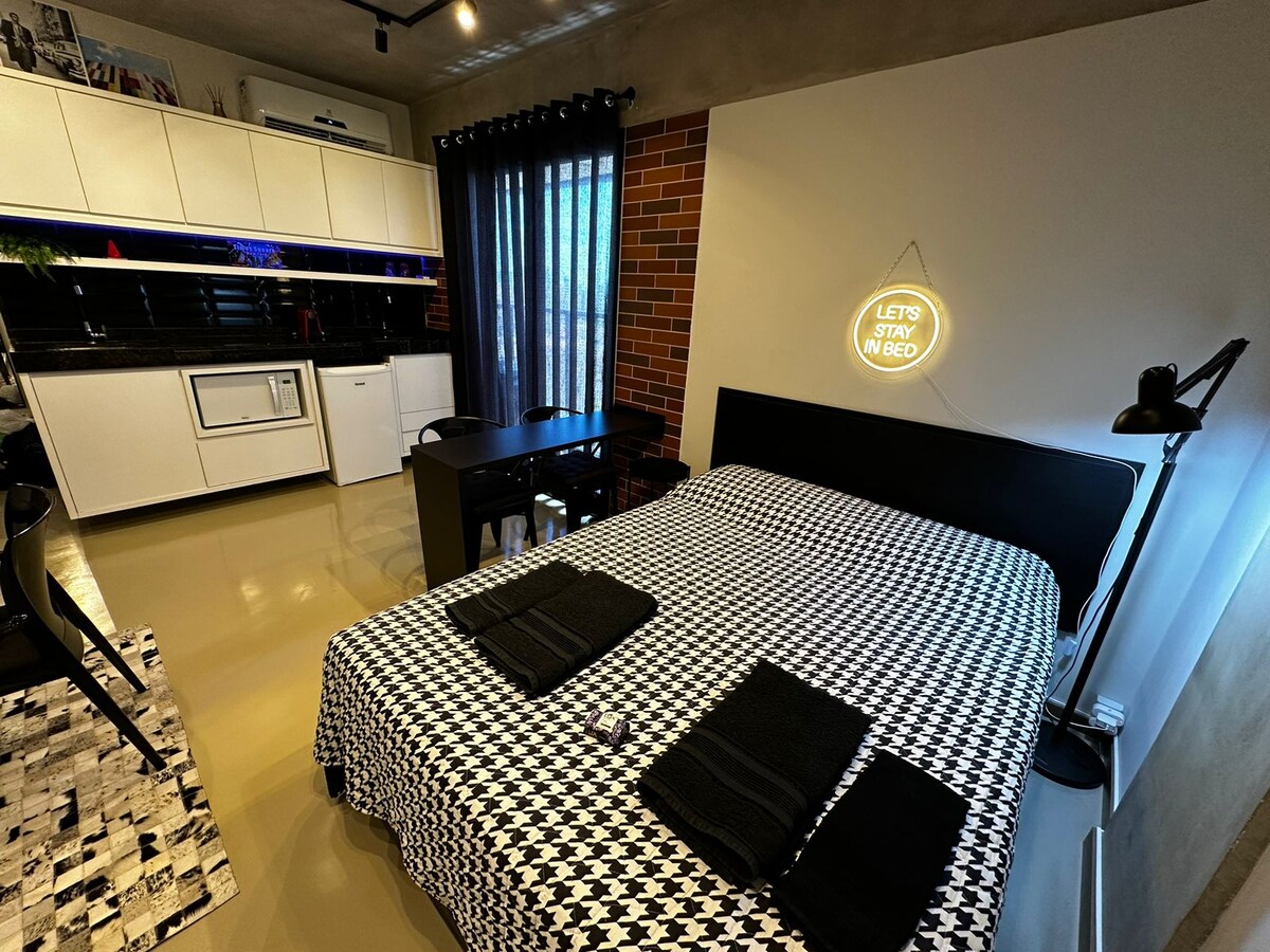 Excelente Kitnet com uma cama de casal para 02 pessoas. Horário de Check-in a partir das 15:00 em diante e checkout ao Meio-dia. Kitnet individual, com 1 quarto e 1 banheiro e 1 Cozinha (pequena). Acomodação com Ar Condicionado, Smart TV, Guarda roupas, Ferro de passar, mesa para laptop. Cozinha com frigobar, cafeteira, sanduicheira, micro-ondas e utensílios elétricos. A garagem e o único espaço compartilhado. "Pet Friendly"