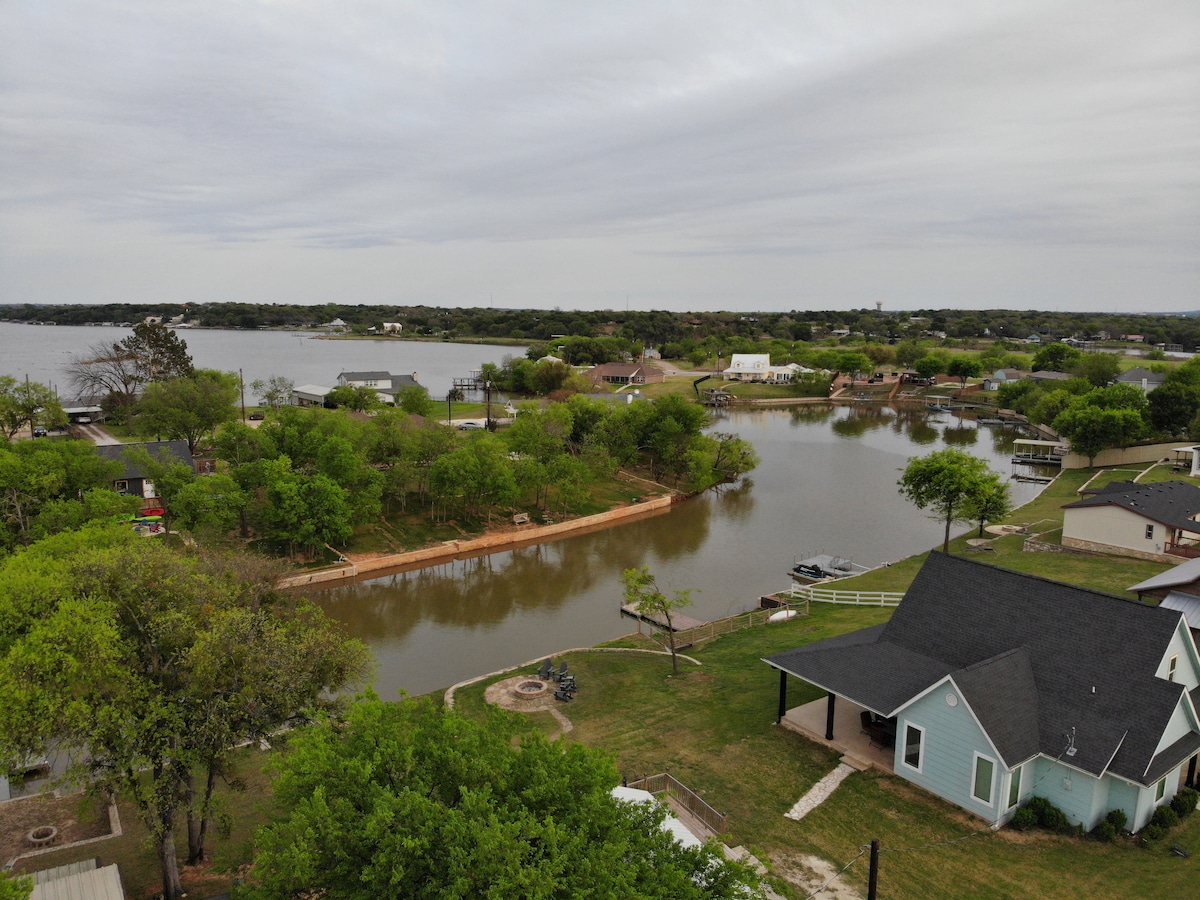 Utrolig adgang til søen med 400 fod privat kystlinje... svømning og flydende fra din private kaj, 2 kajakker med nem adgang fra bådrampen, fiskeri, fuglekiggeri, grill og en middag i måneskin. Beliggende i et dejligt kvarter kun 5 minutter fra den smukke Granbury-plads med butikker, live-teater og fine restauranter. Indendørs vil du blive blændet af udsigten og nyde senge i resortstil med fint sengetøj og bløde badehåndklæder med Do Terra Spa-produkter og frisk kaffe.