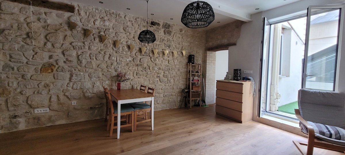 Denne karakterfulde lejlighed ligger i det historiske og livlige kvarter Marais, i en stille og smuk gårdhave med træer. Du vil blive forført af dens landlige stemning, dens møbler, dens genstande og kunstværker, der er udvalgt med omhu. Lejligheden består af en stor, lys stue under et glastag, en lille stue, et soveværelse, et badeværelse og et brusebad. Dette poetiske, rolige og lyse sted er den ideelle base til jeres ophold i Paris!