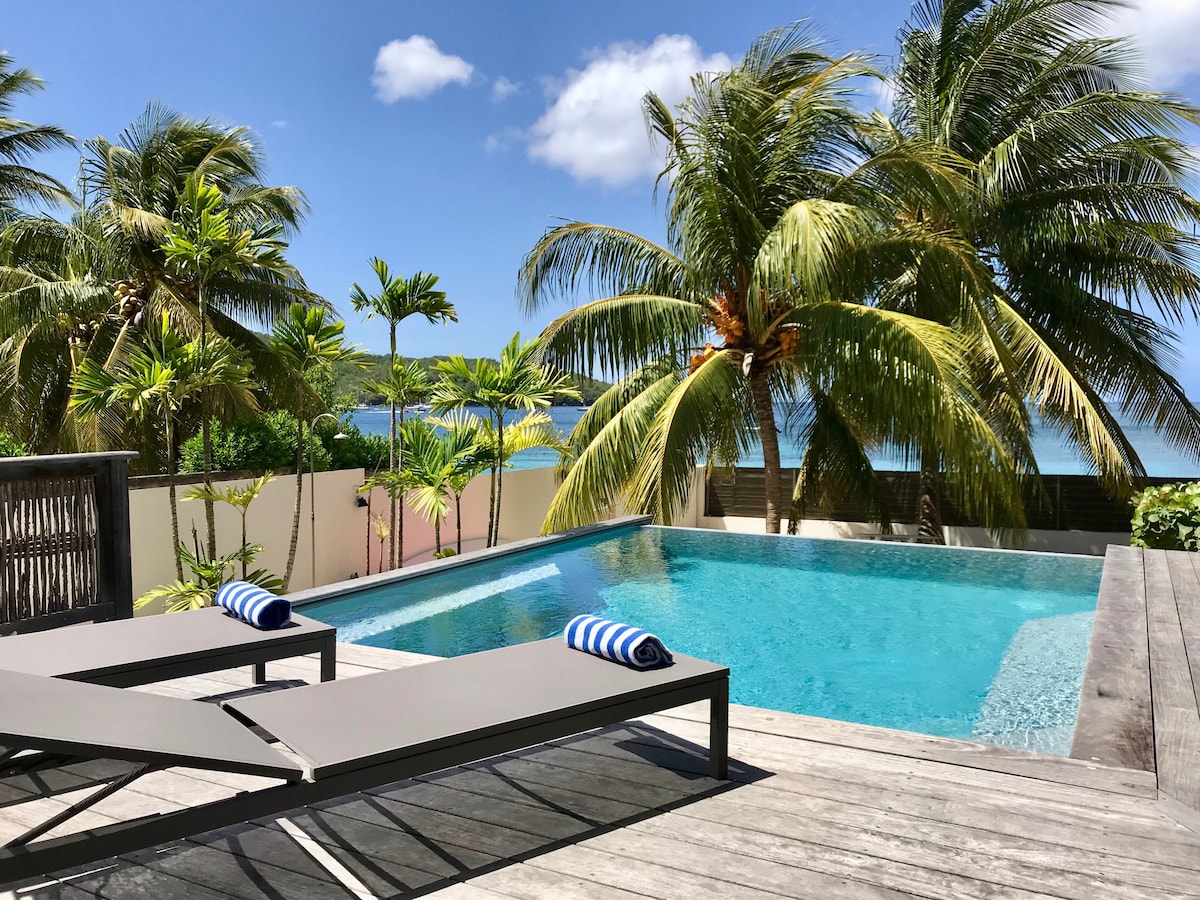 Charmerende moderne uafhængig airconditioneret lejlighed (322 kvm), ejerens villa i stueetagen, træterrasse ved vandet (160 kvm). Dette unikke sted tilbyder en fantastisk udsigt over ankerpladsen Grande anse d'Arlet og direkte og gratis adgang til vores private kaj og til havet. Tre minutters gang fra den rolige strand Grande anse langs vores private vejbane.