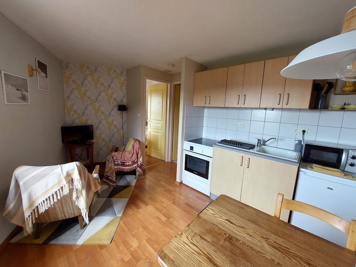 Rolig lejlighed på 45 m² med en stor lys stue med udsigt over Larmont (bjerg). Alle butikker ved foden af bygningen - gratis parkering i nærheden. Køkkenhjørne: kogeplader, ovn, køleskab / fryser, mikrobølgeovn, brødrister, kedel ... Soveværelse: 1 dobbeltseng, stort skab med bøjler til rådighed Stue: TV, wifi og sovesofa til 2 personer Kæledyr ikke tilladt, fester forbudt.