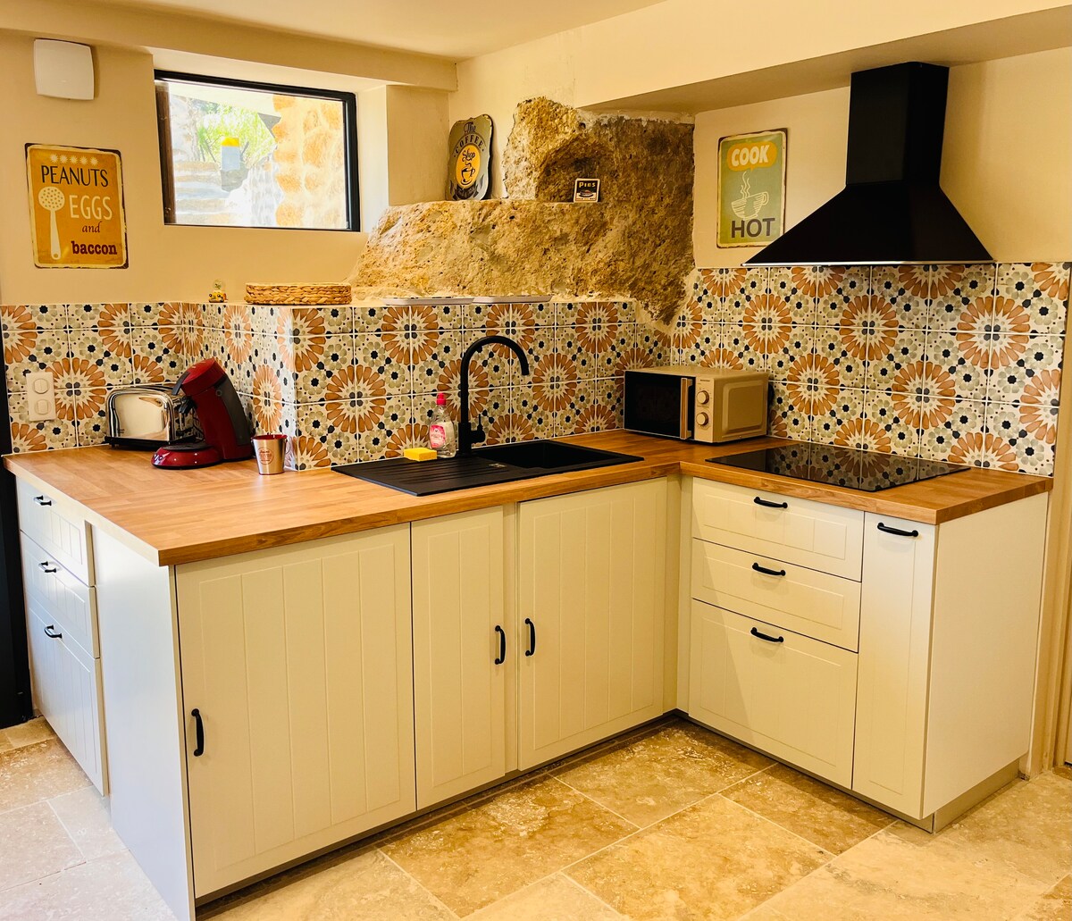 Boligen på 50 m² omfatter en stue med sofa og udstyret køkken, et separat soveværelse og et badeværelse med badekar og walk-in-brusebad. Du kan nyde en behagelig terrasse. Hele stedet er blevet renoveret. En privat spa venter dig i drivhuset, en ideel kokon til at koble af på et atypisk sted. Vi ses snart Caroline og Christophe