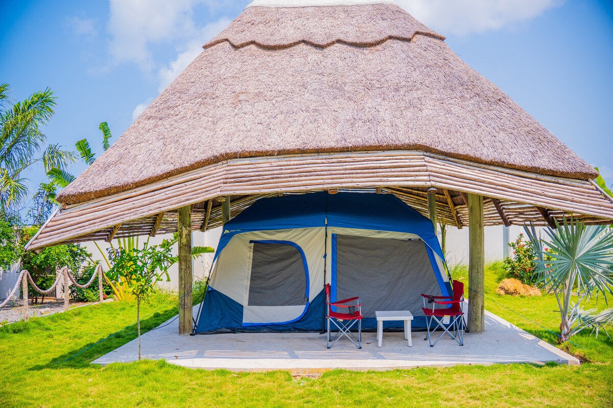TO VANDTÆTTE CAMPINGTELTE, der hver har plads til 2 personer. Godt udstyret med komfortable madrasser, bærbare lamper, udendørs badeværelse med varmt brusebad og en tre-stens madlavningsoplevelse. Prisen inkluderer ● Morgenmad, selvforsyning (mælk, æg, frugt, bagte bønner, juice og brød) ● Wi-fi, men ikke så stabil Grundlæggende spil● på stedet (bueskydning, Jenga, Tic-tac, badminton og træk) ●Bonfire, halv kulgrill ●Sæbe, håndklæder, hjemmesko, servietter og drikkevand ●Lysthusområdet og personale på stedet