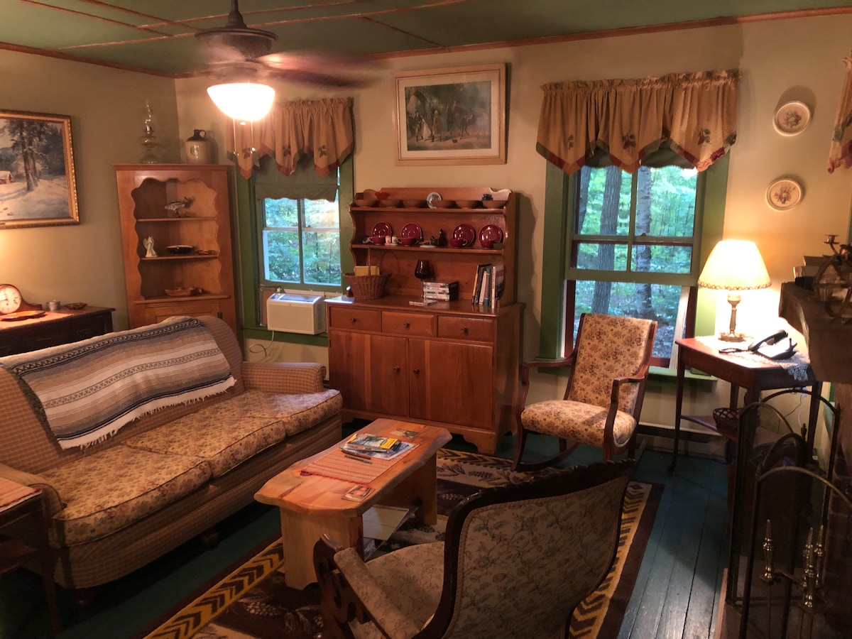 The Cottage at Brookledge tidligere sommerlejr for piger -11 miles fra Sacandaga Lake -12 miles fra downtown Saratoga + SPAC - Kæledyrsvenlig - 60 hektar indhegnet ejendom - Ildsted - Udsigt over bæk med terrasse - Varme - Vintage køler, intet køleskab - Kogeplade, grill, kedel, gryder, pander, redskaber, service -Privat udhus - Brusere i badehus (åbent året rundt) - Vandbeholder i hytten - Jackery-generator til elektricitet - Spil, bøger, hængekøje - Ingen Wi-Fi i hytten - Wi-Fi tilgængelig i pavillonen