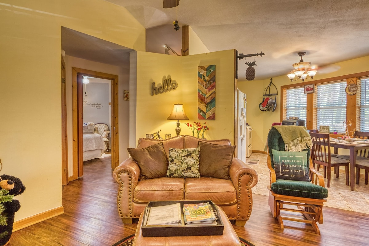 Velkommen til en hyggelig bjerghytte, hvor stille skove, glødende bål og frisk luft fra Smoky Mountains sætter tonen for et afslappende ophold tæt på det hele. – 6 sengepladser | 2 soveværelser | 3 senge | 1 badeværelse - Spabad med udsigt over bjergene – Indendørs pejs med brænde og elektriske pejse - Terrasse med bålplads, hængekøje og udendørs siddepladser - Familievenligt med barneseng, spil, arkade og temarum - Køkken, vaskemaskine/tørretumbler, wifi og dedikeret arbejdsplads
