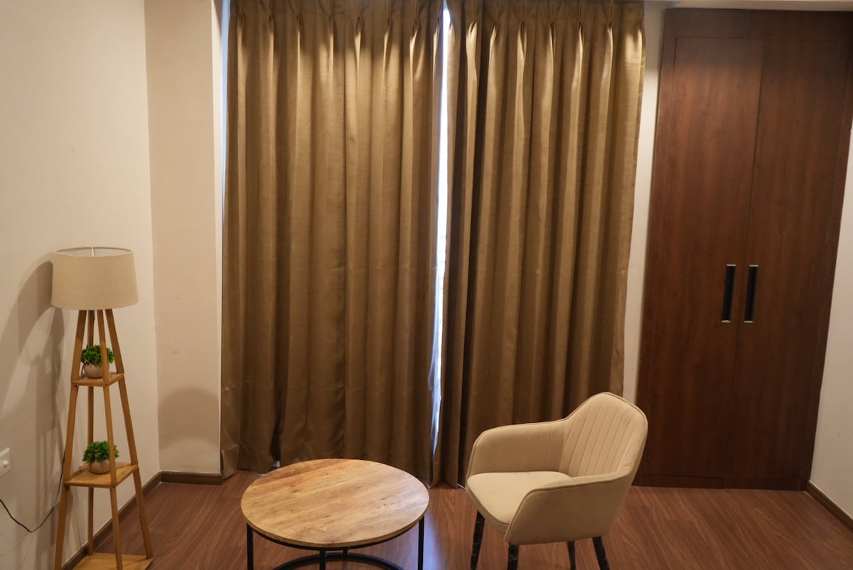 Soak up bright city views from this stylish modern apartment in the heart of Greater Noida, just minutes from India Expo Mart, Wipro, Jaypee Greens, & Pari Chowk. The chic interiors offer a queen-sized bed, smart TV, and AC, with abundant natural sunlight for a warm, inviting vibe. Enjoy powerful 100mbps Wi-Fi for seamless work or streaming, a handy coffee station, and cooking facilities on demand. Ideal for business, leisure, & everything in between