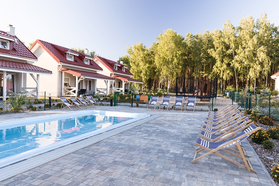 Hus i Rodzinna Przystani med swimmingpool og sauna