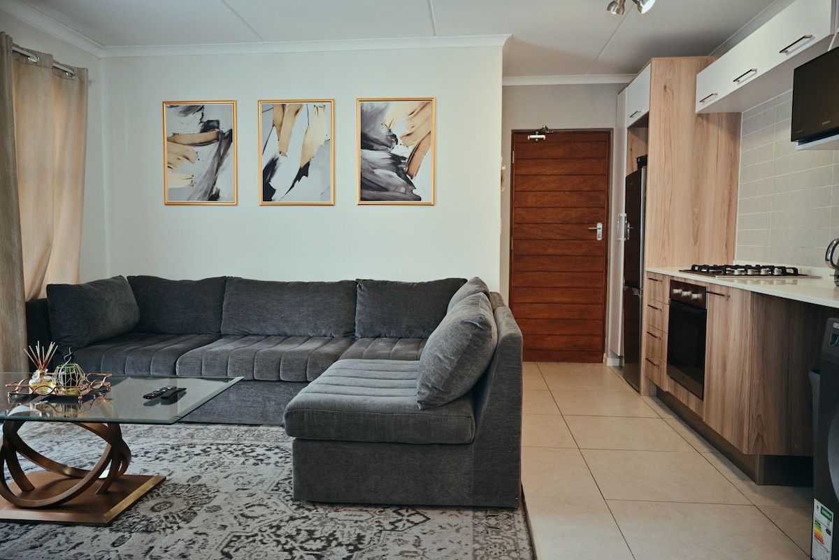 Denne smukke luksuriøst møblerede og indrettede lejlighed omfatter fiber-udkappet ubegrænset Wi-Fi, Full HD TV, medieboks med adgang til Netflix, YouTube, Google Play og andre apps, dolce gusto kaffemaskine, opvaskemaskine, damper og ventilator. Perfekt beliggende mellem Sandton (15 min) og OR Tambo (15 min). 5 min til Greenstone, Stoneridge og Flamingo Mall, Greenvalley Center og Modderfontein Nature and Golf Reserve. Alle faciliteter leveres til køkken og badeværelse