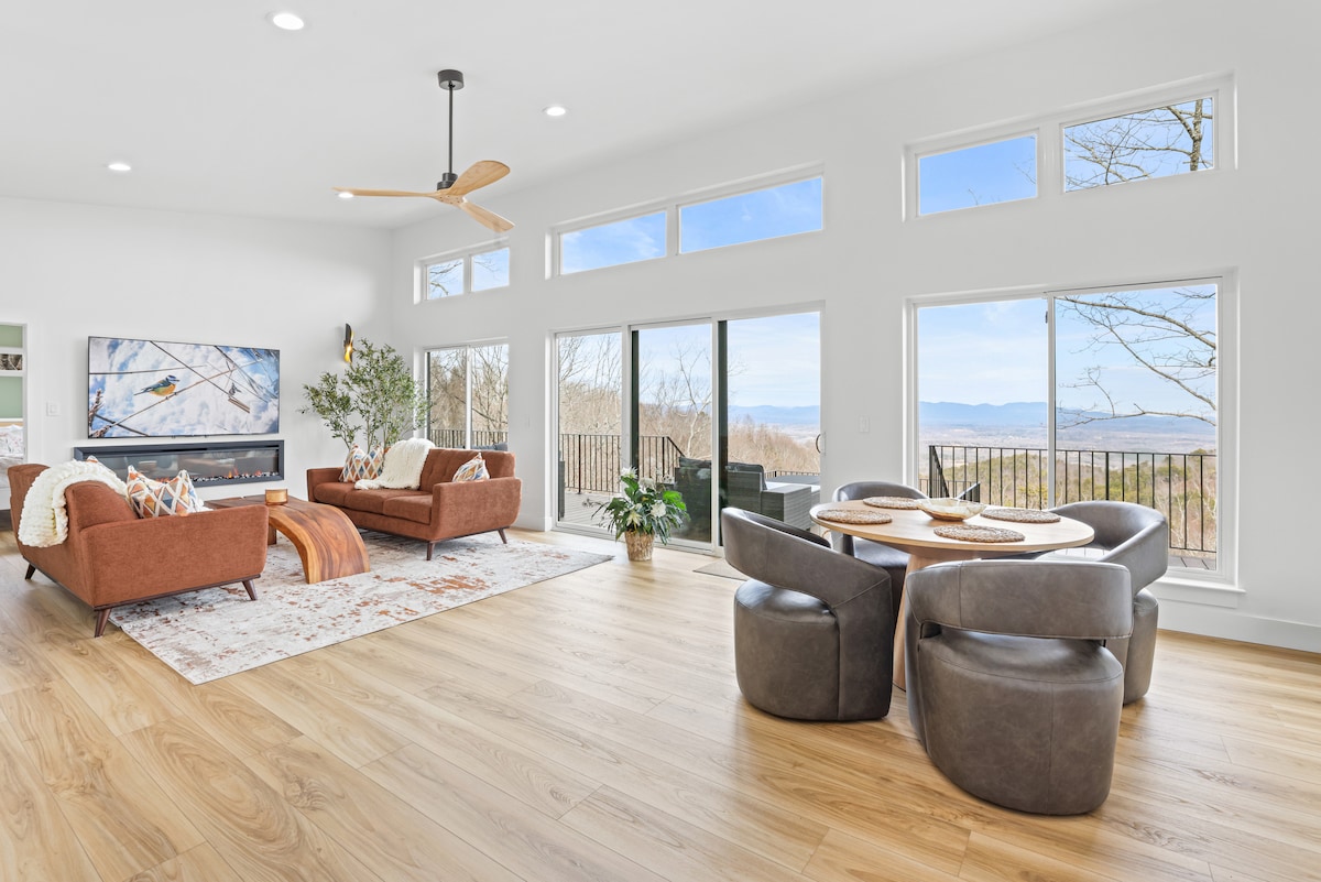 Velkommen til Mountain Modern Base Camp, hvor du kan nyde naturens ensomhed, mens du er en kort køretur fra ubegrænsede aktiviteter. Privat ejendom på 7+ hektar med udendørs pejs, fuld pickleball- og basketballbane, bæk at nyde (med et lille vandfald), bålplads med Mtn. Udsigt. 30' lofter med store vinduer i de vigtigste opholdsområder og loft. Køkken, opholdsområder, loft, terrasser og skov er indrettet perfekt, så alle kan have deres eget rum eller være sammen under dit ophold.
