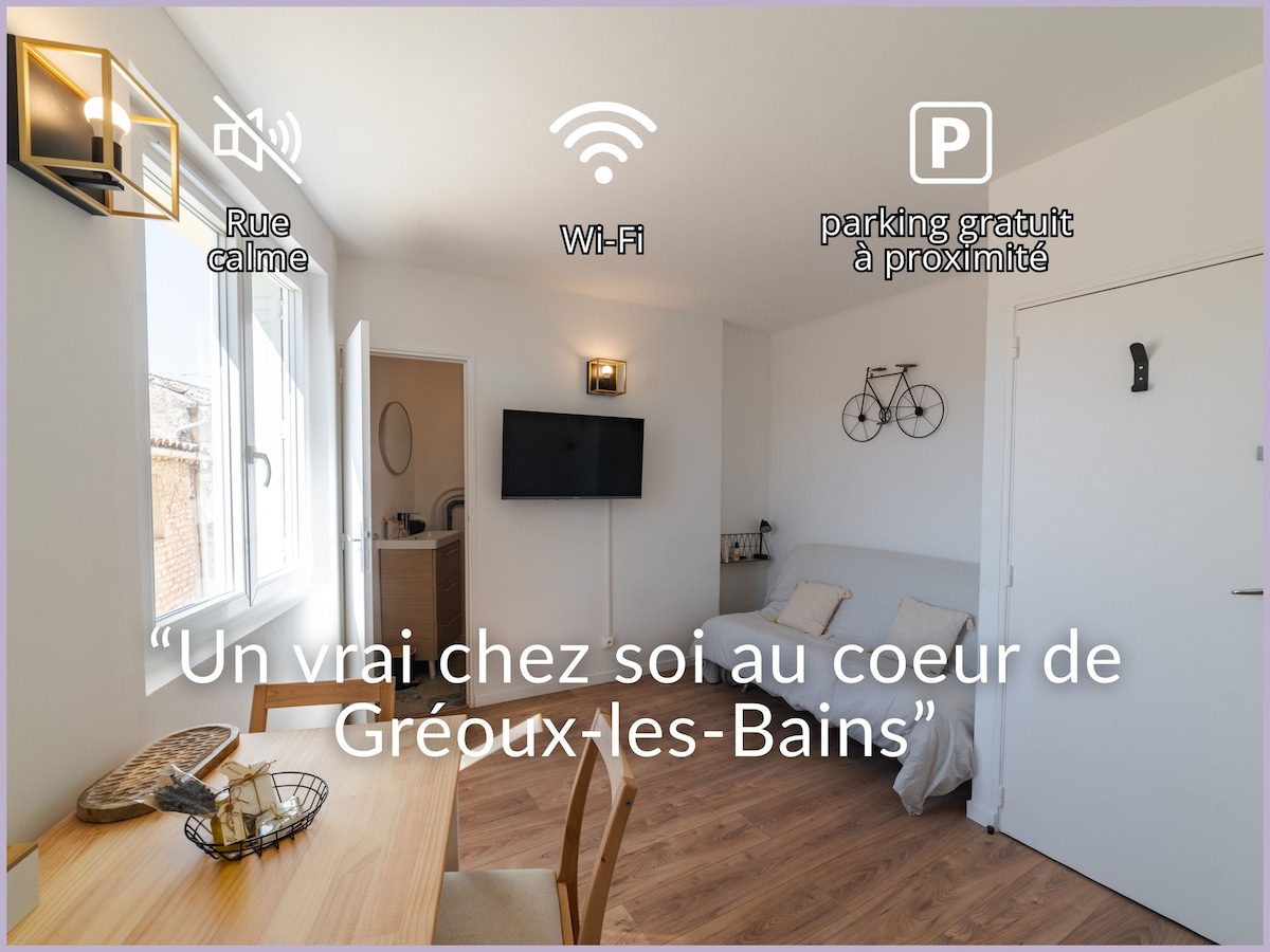 Charmerende renoveret studie i Gréoux-les-Bains – Tæt på Gorges du Verdon og spa. Velkommen til denne hyggelige lejlighed på 18 m², der er ideel til en udflugt til Gréoux-les-Bains. Denne hybel tilbyder alle moderne bekvemmeligheder for et behageligt ophold. Ideel til kurister, naturelskere eller rejsende, der søger ro og komfort. Vi har renoveret denne hybel med passion og omhu for at skabe et rum, hvor ro og velvære hersker, og som er befordrende for et beroligende ophold.