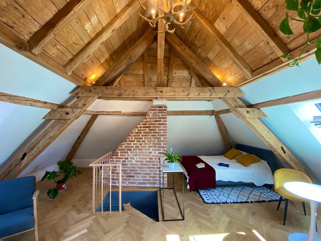 En lille, atypisk og hyggelig studiolejlighed på tagterrasserne i den middelalderlige by Munster. Perfekt udflugt for besøgende, der ønsker at opdage Alsace i et smukt studie, der kombinerer varmen fra et træhytteloft med elegancen af et moderne loftsdesign. Studiet er fuldt udstyret til kortere eller længere ophold med et åbent køkken, stue/spisestue, moderne badeværelse og soveværelsesområde og bibliotek.