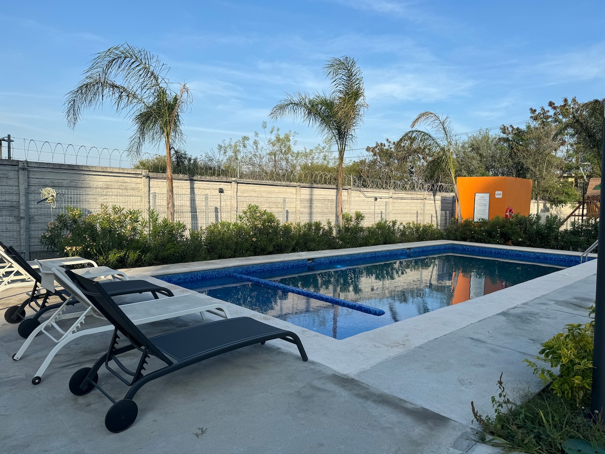 Hav det sjovt med hele familien i dette stilfulde overnatningssted. Vælg mellem to pools, hvil på ortopædiske madrasser i områder med aircondition, mens du ser tv, lyt til musik, mens du laver mad/vasker op, og vågn op med kaffe for at starte din dag godt. Alt, mens du føler dig tryg: vigilantes og kameraer 24/7. Parking techado, HEB crossing the street, 7 minutes from Paseo la Fé and 20 minutes from the airport.