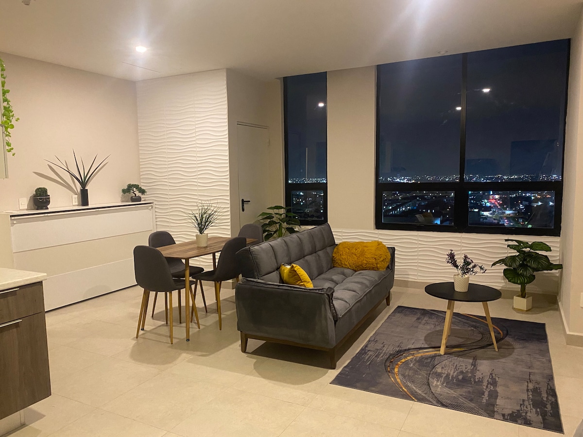 FACTURAMOS - Vand 24/7 - 3 personer Velkommen til Puntacero! Vi glæder os til at byde dig velkommen i en af vores mest luksuriøse Airbnb-boliger i Monterrey. Lejlighed med enestående finish og udsigt over Cerro de la Silla. Unik beliggenhed! Wi-fi, smart-tv, aircondition, 1 parkeringsplads. Ideel til ledere, familier og turister. Sikkerhed 24/7, 3 elevatorer, FREMRAGENDE FACILITETER. Indkøbscenter med restauranter og en OXXO i nærheden. Kingsize-seng og dobbelt sovesofa.