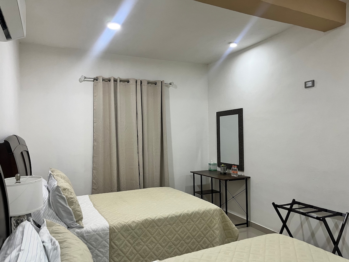 Departamento con 2 recamaras con cama matrimonial y closet, un baño con sanitario, bañera y lavamanos, cocina con estufa eléctrica, refrigerador, cafetera, microondas, licuadora y utensilios de cocina. comedor, barra y sala de estar con sofá cama y televisión, zona de lavado: lavadora, secadora y lavadero.