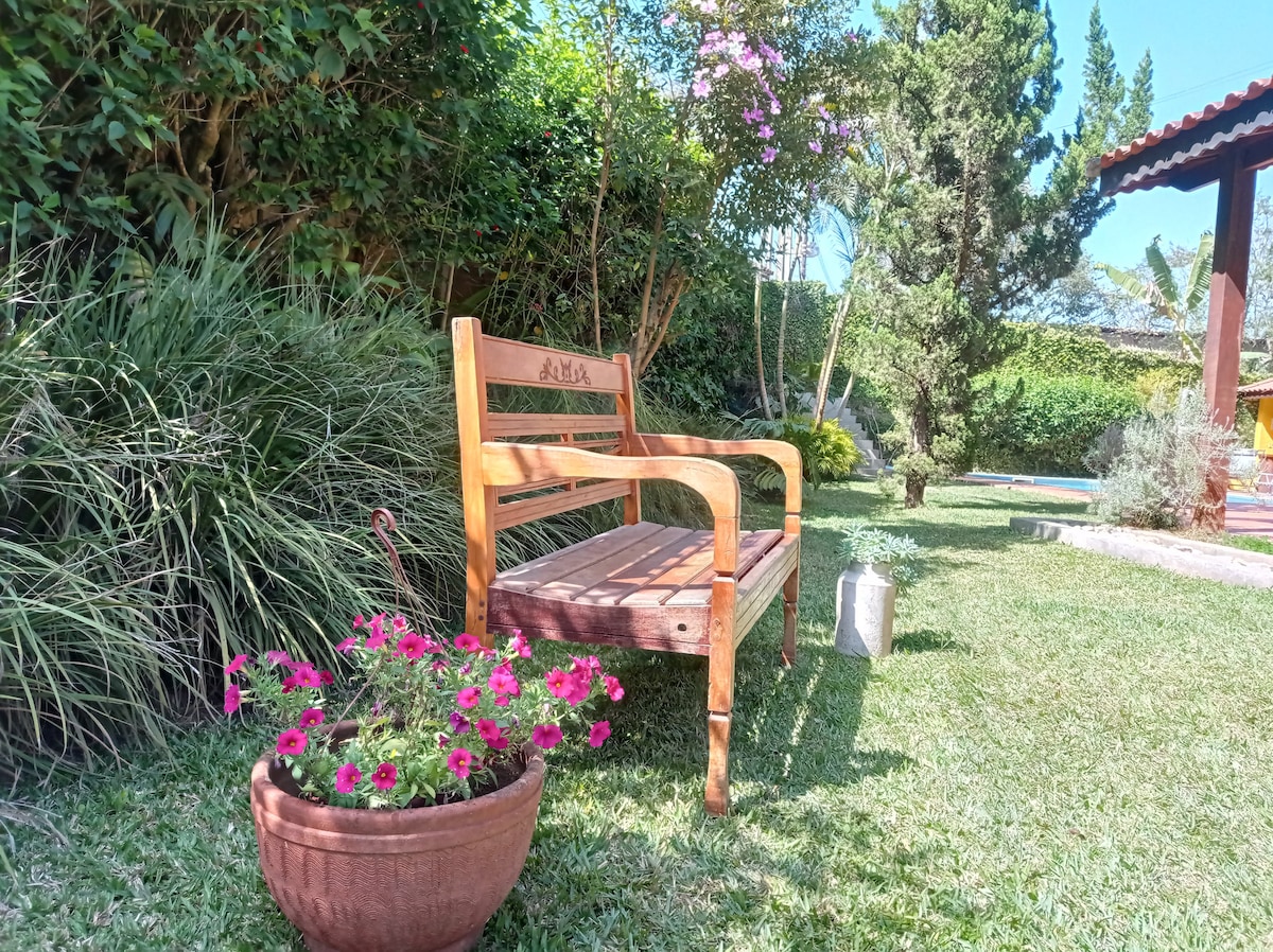 Kender du det sted, hvor du kan høre fuglene synge, og børnene kan bruge energi på 1500 m2 græsplæne, for ikke at tale om det forfriskende svømmebassin? Du kan finde det her i Guararema! Beliggende midt i naturen med et privat og fladt område tæt på centrum og med al vores omhu for rengøring, så vi kan modtage dig i denne meget følsomme tid. Vi har en komplet struktur med kvalitetsinternet, så du kan føle dig hjemme i dit sommerhus. Kom og del en ny oplevelse!