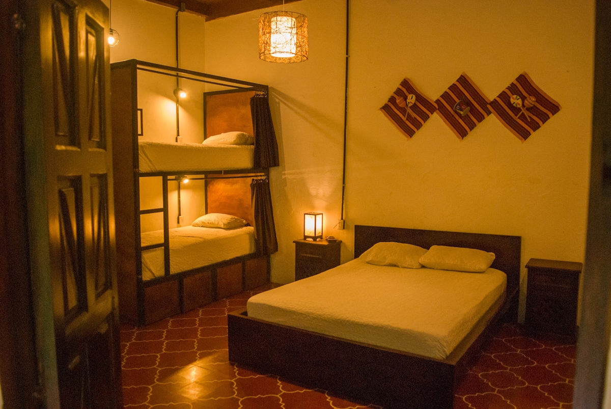 We provide you with a pleasant environment, where you can relax quiet and comfortable, we have areas to work and thus enjoy easy access to shops, typical markets, restaurants, bars and popular museums, from this charming place to stay, within the most Beautiful Colonial City of Guatemala, full of culture and tradition. Bemærk: Værelset er til fire personer og er blevet ombygget. Det har nu 2 dobbeltsenge. Det har ikke 3 senge som før.