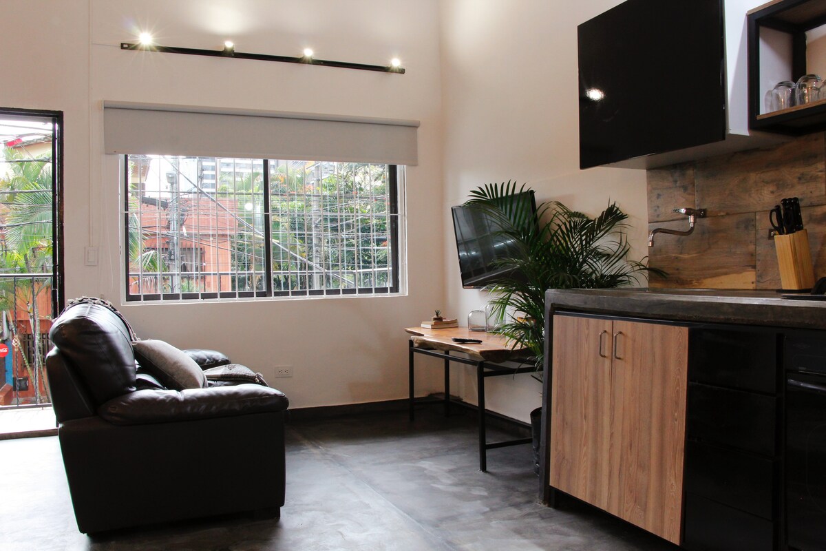 Fuldt møbleret suite på 28 m2 med aircondition og tekøkken. Beliggende i et af de bedste områder i Medellin, i et meget roligt kvarter tæt på alle de steder af interesse. Suiten har en spektakulær udsigt over byen og bjergene. Du kan gøre brug af coworking-området, fitnesscenteret og en spektakulær kaffe, der tilbyder forskellige typer drikkevarer baseret på den bedste colombianske kaffe, du kan nyde din drink på terrassen på 2. sal i bygningen.