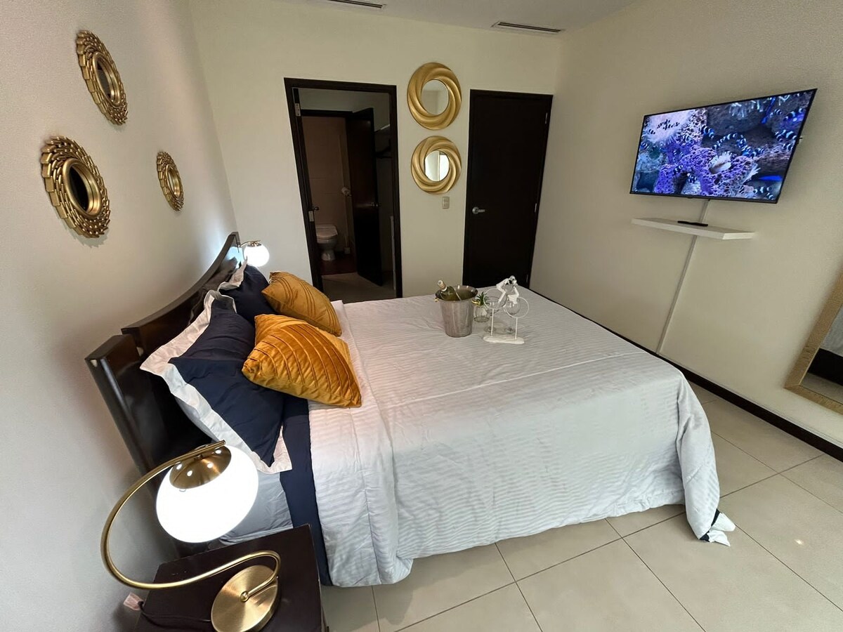 EKSKLUSIV LEJLIGHED I PUERTO SANTA ANA | TURISME OG FJERNARBEJDE | WI-FI + PARKERING | LUKSUS BELLINI 3-BYGNING MED ELEVATOR OG FÆLLESOMRÅDER ✨Et sted, der er designet til at få dig til at føle dig hjemme 👤 Op til 7 gæster · 🛏️ 2 soveværelser · 🛌 3 senge + 1 sovesofa 🚗 Privat parkering inkluderet (yderligere muligheder tilgængelige) 🏊 Swimmingpool, fitnesscenter og jacuzzi 📍Puerto Santa Ana, ved siden af Guayas-floden, tæt på Malecón 2000, Las Peñas og Cerro Santa Ana 📶 (1 GB) Wi-fi · 📺Netflix En behagelig bolig, hvor man kan slappe af eller arbejde.