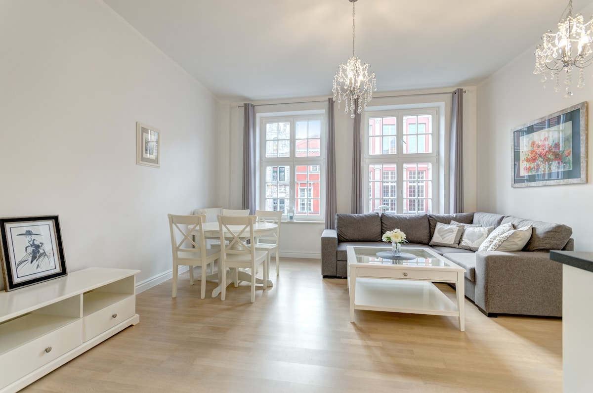 Dette er en unik (2-værelses) lejlighed beliggende i centrum af den gamle bydel, på den mest prestigefyldte gade i Gdańsk - Długa Street. Også kaldet den Kongelige Rute. Fra vinduerne kan du se Lange Gade, Neptuns Fontæne, Lange Marked, Rådhuset, Gylden Port. Hvis du vil have mere end bare et sted at sove, anbefaler jeg denne lejlighed. Dens originale indretning, der blander antikke og moderne elementer i et stort rum, hjælper dig med at opleve Gdańsks uforglemmelige charme.