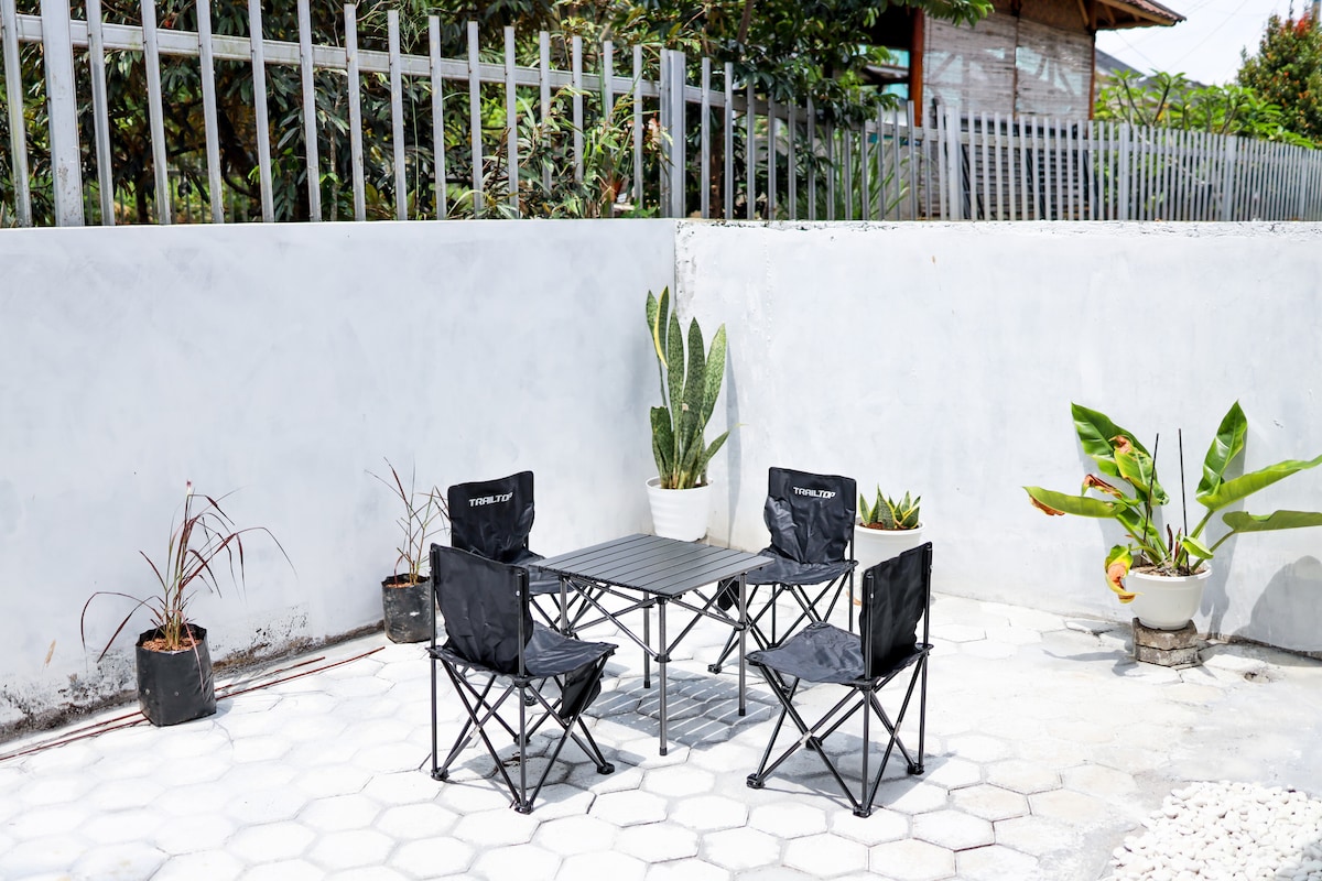 This modern tropical-inspired house features two bedrooms, two bathrooms, an open-concept kitchen, and dining area. It's located in downtown Sukabumi, 5 minutes to the hospital, 7 minutes to shopping centers, and 10 minutes to trendy cafes. It's a 30-40 minute drive to tourist attractions like Goalpara Tea Park and the Situ Gunung Suspension Bridge. It's a 20-minute drive to Pondok Halimun and Selabintana.