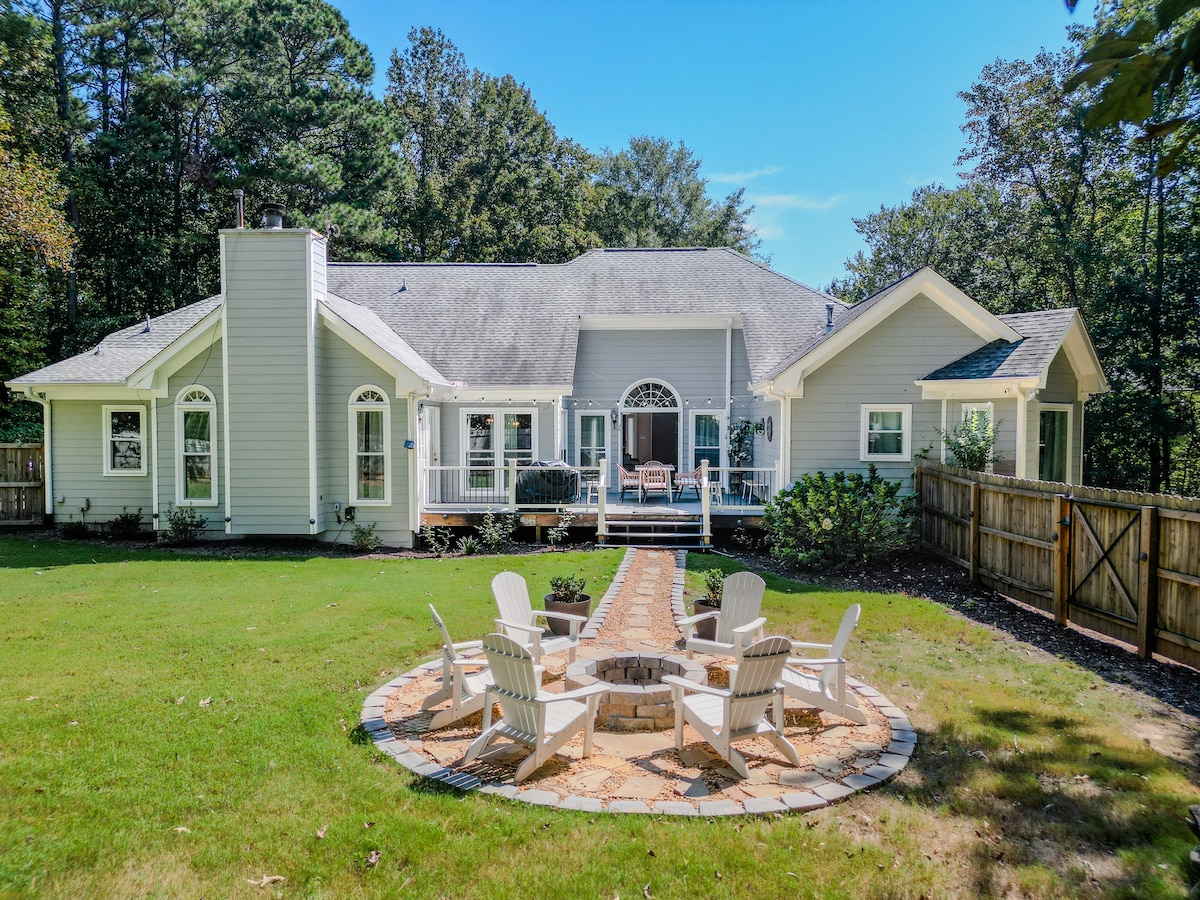 Velkommen til dit private, solbeskinnede fristed, der ligger på en skovklædt grund nær Atlanta. Denne rummelige bolig er designet til, at familier og grupper kan samles, fejre og slappe af. Den har lyse stuer, et professionelt køkken og en master-suite med et spabad. Kælderen er dit knudepunkt for sjov og wellness med en biograf, spillerum, legerum til småbørn og yogarum. Udendørs løber børn frit rundt i den indhegnede gård, mens voksne griller på terrassen eller deler historier rundt om bålstedet under stjernerne