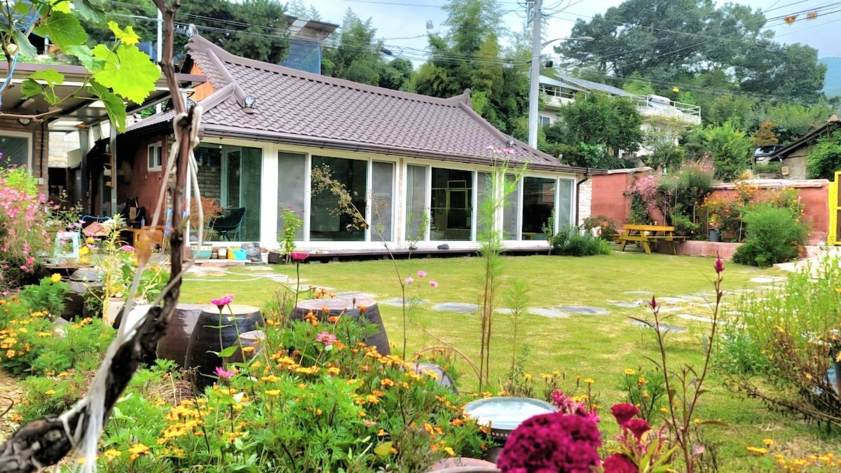 Det er et nybygget traditionelt og forbedret hanok-hus, Bunghwangyeonga, bygget i 2023. Det er en privat pension (55 pyeong), der kun modtager 1 hold. Koreas mest repræsentative historiske og kulturelle seværdigheder ligger lige foran. - National skat nr. 30 Bunhwangsa 2 minutters gang - Hwangnyongsa-tempel 5 minutters gang - 15 minutters gang til Donggung og Wolji - Cheomseongdae, Cheonmajeong, Hwangnidan-gil, Bomun Complex 5-10 minutter i bil Vi håber, at du kan føle dig afslappet med din familie og kæreste i et nybygget traditionelt og forbedret hanok, væk fra den komplicerede by. Bekvemmeligheder - Køkken med bord til 6 personer, aircondition, køleskab, elkogeplade, mikrobølgeovn, kaffekande, kaffemaskine, opvaskemaskine, vinkøleskab, 4-blus gasblus, stegepande, gryder, service og andet køkkenudstyr - 85 tommer stor TV (Netflix, YouTube tilgængelig), luksuriøs sofa og møbler, affugtning, luftrenser, cirkulationsventilator, stemningsbelysning, rummelig og behagelig stue med aircondition - Udendørs græsplæne have med privat grillplads (udendørs spisebord til 6 personer), installation af stemningsfulde pærer - Parkering tilgængelig i lejligheden (3 biler)