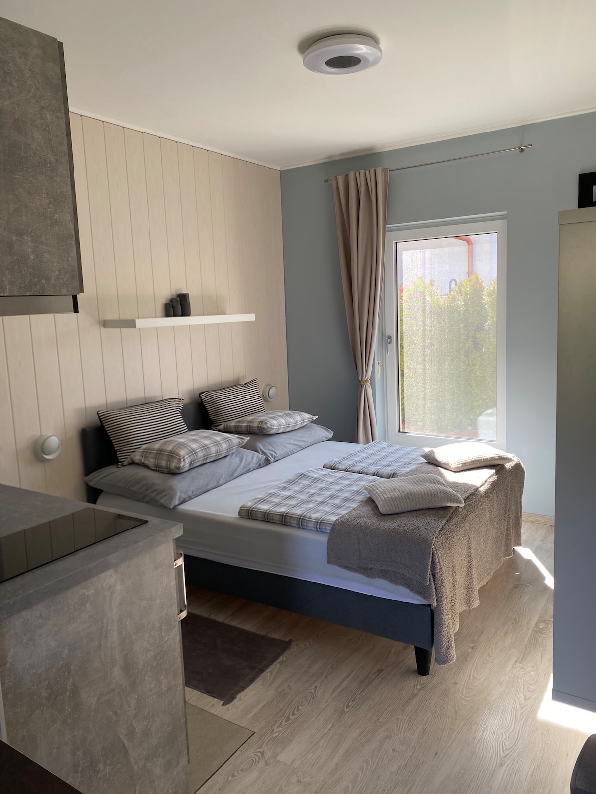 Den moderne lejlighed med en unik atmosfære ligger i en rolig blind vej, men alligevel meget tæt på alt. Ud over universitetet, floderne, strandene og cykelstien i Wien-Budapest ligger de historiske centrum og termiske bade kun få minutters gang derfra. Kulturelle, underholdning og sportsmuligheder er meget nemme at nå inden for kort gåafstand. Studiet er komplet med en hyggelig træterrasse. Der er gratis parkering og morgenmad.
