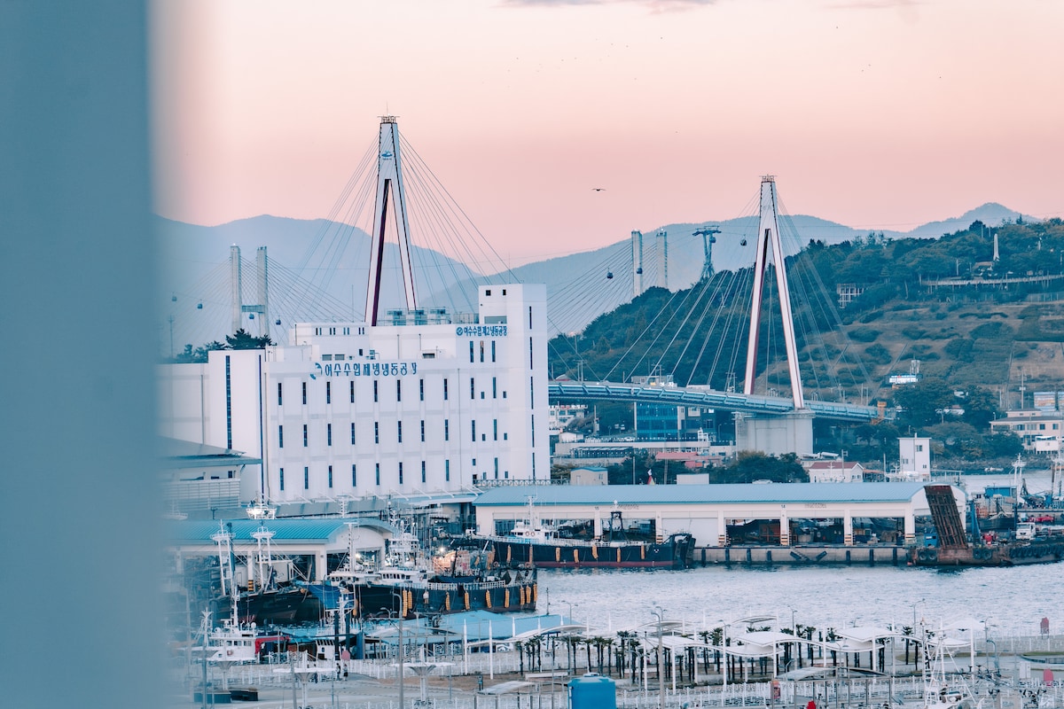 Det er en ny bygning med havudsigt, hvor du kan se Dolsandaegyo-broen, så den er rummelig og ren.🌊🩵 Det er meget tæt på de vigtigste seværdigheder og er et godt sted at bo sammen med venner og kærester eller en familie på 2-4 personer. Denne bolig har en dobbelt struktur med en stue, køkken, badeværelse, soveværelse (adskilt fra stuen, queensize seng) på første sal og en madras, hvor to personer kan sove komfortabelt på anden sal. Du kan nyde solopgangen om morgenen og nattens hav- og byudsigt over Yeosu, som har en klar udsigt over havet foran Namsan. Derudover er der installeret varmekabler på begge etager, så du behøver ikke at bekymre dig om kulden om vinteren. Om sommeren er der installeret et airconditionanlæg, så du kan nyde en kølig ferie. (1 i stuen, 1 i soveværelset, i alt 2) Disney Plus OTT tilbud Det ligger 1 minut i bil fra Yeosu Expo Station. Du kan gå til Sea Cable Car, Big O Show, Handsome Cruise Fireworks Show, Yeosu Romantic Poch Street, Odongdo, Aqua Planet og Marine Park. Det er også muligt at bo i Yeosu i en måned, så kontakt os venligst 🏡❣️