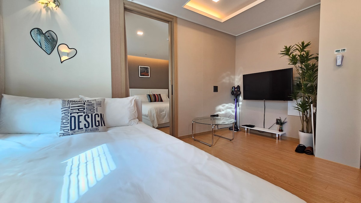 Lige ved siden af🌊 Millak the Market er dette en ejendom, hvor du kan se Gwangan Bridge og havet på et øjeblik! Det har den bedste udsigt over🌊 Gwangalli med en frontal udsigt over Gwangan-broen. Det er en🌊 ren og behagelig ny bolig med masser af plads, følelsesmæssige interiørtilbehør og forskellige faciliteter. Vi vasker sengetøjet hver dag med de bedste værelsesforhold på🌊 hotellet. Beliggende 3 minutters gang fra🌊 stranden, kan du bo komfortabelt og behageligt væk fra den støjende bymidte. Der er gratis parkering i🌊 bygningen. 🌊Standard 2 personer, maksimum 5-6 personer (topmadras leveret, sovesofa tilgængelig, ekstra sengetøj leveret) 2 🌊soveværelser, stue, badeværelse, gæstetoilet, vaskerum 🌊Bruserummet er adskilt. 🌊Indtjekning kl. 16.00 Udtjekning kl. 12.00 (Der er en opbevaringsbutik i nærheden.) 🌊Der er babystole til rådighed:) - Denne ejendom er registreret og drives som et juridisk selskab for indenlandsk delt indkvartering, med forbehold for det særlige tilfælde Mister Mansion!