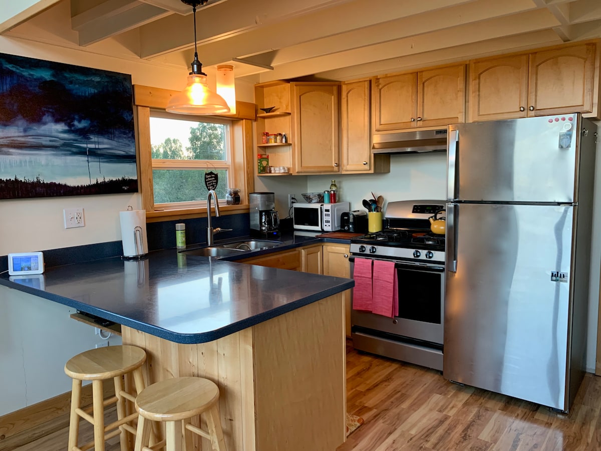 Nyd en smuk sø- og bjergudsigt i moderne stil. Slap af i vores luksuriøse spa-lignende badeværelse med badekar, to brusehoveder og opvarmede gulve, og nyd at lave mad i vores unikke retro køkken. Kun 2,5 miles til den berømte Homer Spit og få minutter fra alle faciliteter, gallerier, bryggerier, charters, hockeybane og lufthavnen.