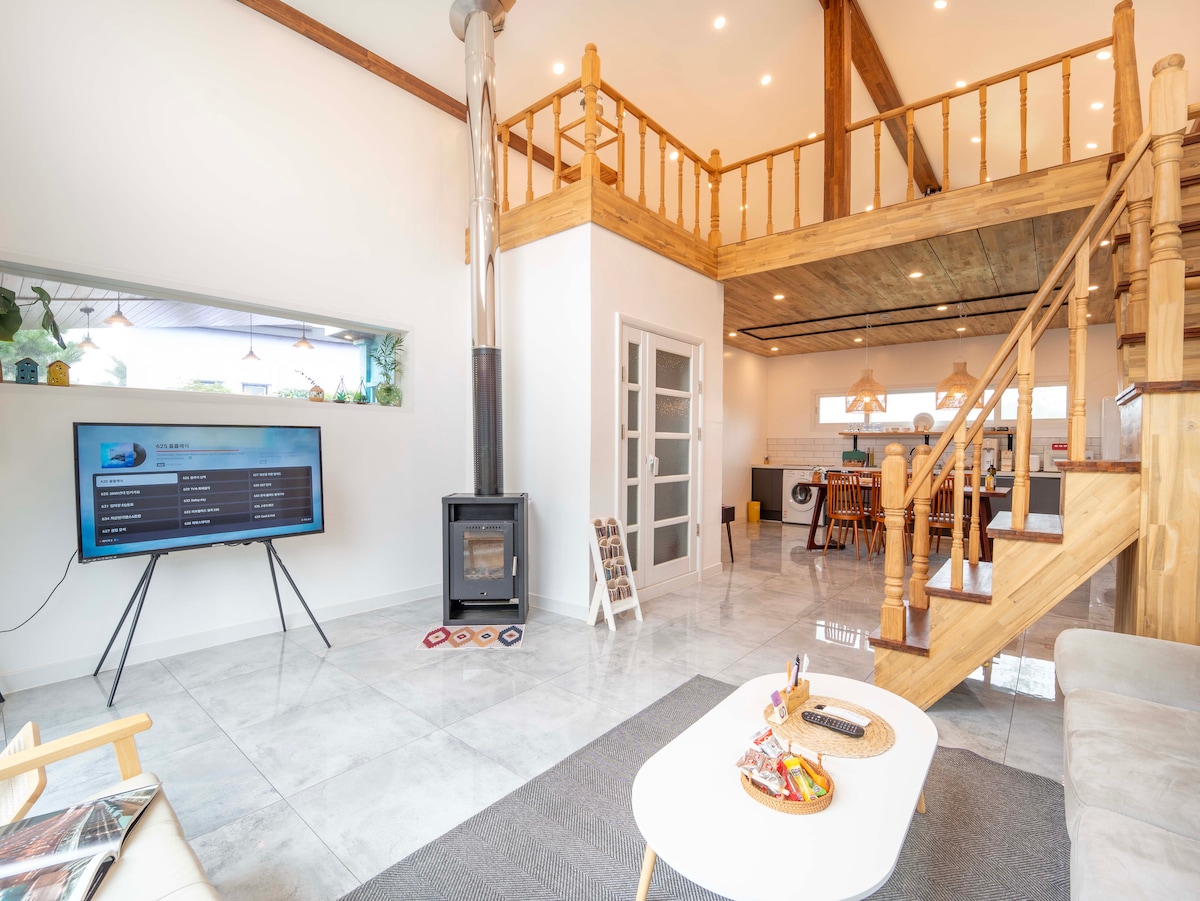 🏡 Vi præsenterer Aewol 309 View Stay. 'Aewol 309 View Stay', der ligger i Aewol Yusooam-ri, det mest eftertragtede nabolag blandt beboerne på Jeju, er et enfamiliehus i 309 meters højde, hvor himmel og hav mødes. Skab uforglemmelige minder i en rummelig bolig, der er stor nok til, at tre familier kan bo sammen. 🏠 Boligkonfiguration * 4 værelser, 3 toiletter, 2 uafhængige køkkener * Familievenlig: rummelig stue med plads til op til 14 personer * Helbredelsessted: Et solrum med godt dagslys forbundet med en stue med en subtil duft af hvid cedertræ * Sensuelt rum: Terrasse med havudsigt og privat atelier på 1. sal 🌅 Se restaurantpoint 180 graders panoramaudsigt: Fra solrummet og terrassen kan du nyde solopgangen, der stiger op over toppen af Hallasan, og den røde solnedgang. ⭐ Romantisk loft på 3. sal Der er et loftsvindue, hvor du kan se nattehimlen direkte, så du kan tilbringe en drømmende tid med dine børn på udkig efter stjernebilleder. En 120-tommers stor skærm giver hele familien en unik oplevelse, hvor de kan se film sammen.