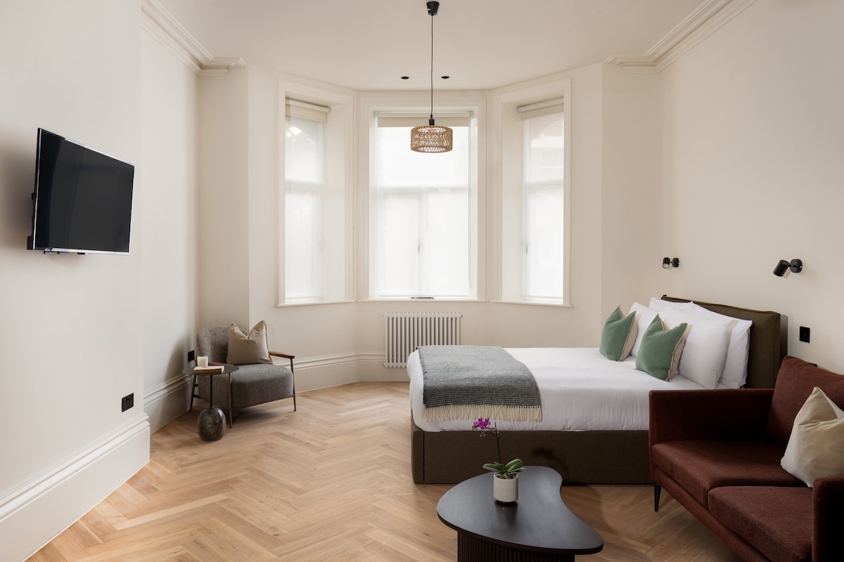 📍Best location! New built flat, just 1 minute from the tube, steps from top restaurants, Hampstead Heath, and Central London. One of the finest flats with AC in Hampstead, this luxurious 2-bedroom / 2 bathroom home comfortably sleeps up to 6 guests. Featuring king-size beds, private entrance, chic design, stylish bathrooms, underfloor heating, and air conditioning in every room. Luxury kitchen with Bosch appliances.