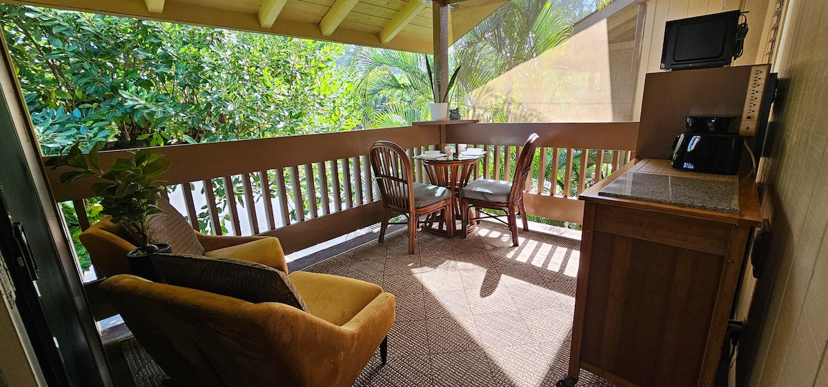 Gorgeous, updated efficiency perfect for an adventurous couple not planning on spending much time at "home." Comfortable queen-sized bed, gorgeous ocean views from your private lanai, and a small kitchenette area with full size fridge and freezer, toaster oven, microwave and coffee maker. This is the perfect place to crash after a long day of exploring this magical island. Boogie boards, snorkel gear, cooler, umbrella, and beach towels also included in your rental. *Note - no washer/dryer or AC
