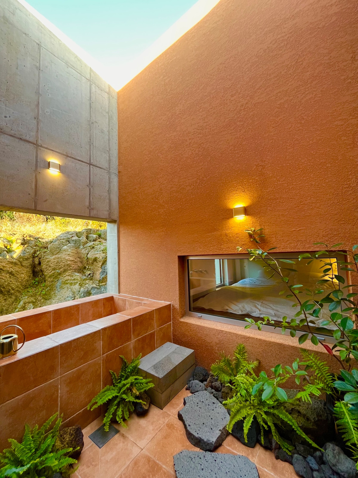 Et privat rum med moderne design, hvor du kan nyde udendørs bad hele året rundt, og hvor du kan nyde udsigten over Gotjawal og Hallasan. Både ROOM og stuen er designet med et gennemgående vindue (tysk Rehau), så du kan nyde landskabet og havet fra alle rum. ROOM er designet uafhængigt af rumadskillelse, og det anbefales til familier, par og venner. - De vigtigste turistattraktioner i vest: Inden for 10-20 minutter med bil, Gapado Pier, Hyeopjae Beach, Camellia Hill, Manor Blanc, Osulloc, Sanyang Keuneng Cape, Firefly Village, Sagye Beach, Shinpung Windmill Coastal Road, Songaksan, Sanbangsan, Yongmeori Coast, Marado (Gapado) Pier, Lunapol, Bilmuseum, Figurmuseum, Thinking Garden, Soingook Theme Park, Glass Museum og andre turistattraktioner ligger i nærheden, så du kan nemmere nyde din rejse. - Indkørselsvej og parkering: Det er et velorganiseret boligkompleks, så indkørselsvejen og vejen er brede. Der er en stor parkeringsplads i boligen, så du kan parkere nemt. - Der er 4 supermarkeder inden for 10-15 minutters afstand, så du kan nemt bruge dem.
