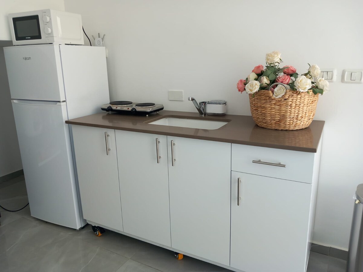 En charmerende lejlighed med et soveværelse, en gårdhave, et tekøkken og et spise-/arbejdsområde. Hold kontakten, og nyd gratis Wi-Fi, Netflix, tv-kabler, vaskemaskine og kaffemaskine, og drag fordel af supermarkeder, falafel- og shawarma-butikker og Pedro-restauranten i nærheden. Hovedbanegården ligger 1 km væk, og de nordlige strande ligger mindre end 2 km væk. Gå ikke glip af denne fantastiske mulighed for at opleve komfort, bekvemmelighed og stil, når det er bedst!