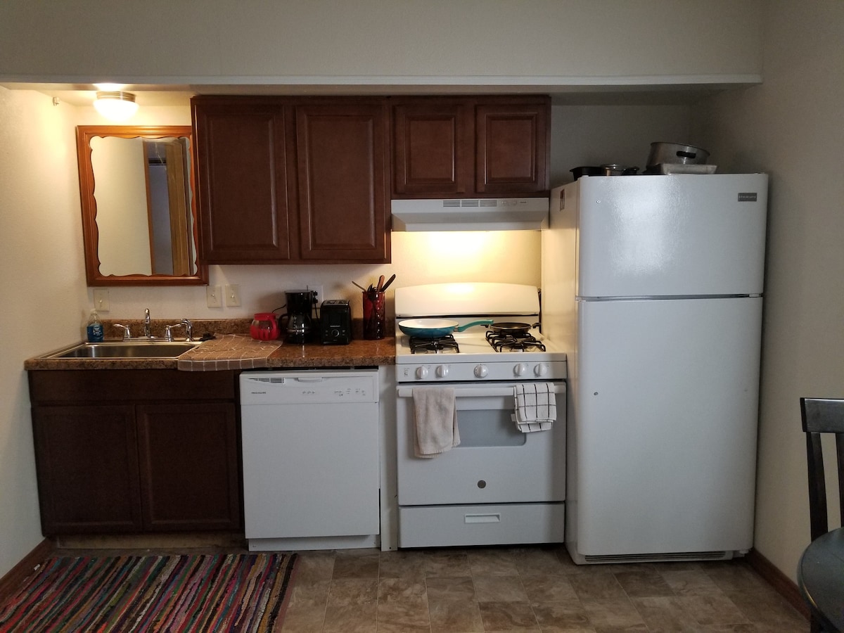 Stilfærdig lejlighed til én person eller et par, der leder efter et andet hjem. Minimumsophold på 3 dage. Alt er til rådighed: fuldt udstyret køkken, tv, wi-fi, kabel-tv, Pluto TV, vaskemaskine og tørretumbler, overdækket parkeringsplads. Beliggende på vores grund på to hektar i skoven, kun 10 minutter fra byen og med god mobilforbindelse til alle større udbydere. Kæledyr er velkomne, der er et kontant gebyr på 100 $, der betales ved indtjekning for kæledyr. 10% rabat for ugentlige ophold og 20% rabat på månedlange ophold.