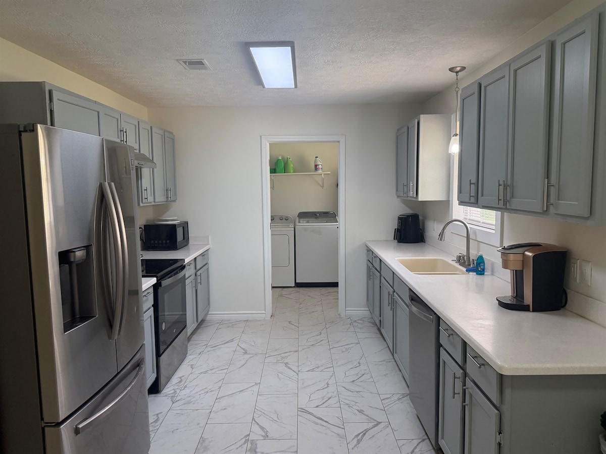 Charmerende 3-værelses retreat med rummelig baggård Vores bolig med tre soveværelser og to badeværelser er perfekt til folk, der rejser med arbejdet, og har et rummeligt arbejdsværelse med et skrivebord, fiberoptisk wi-fi med høj hastighed og et 65" smart-tv med Netflix og Discovery+. Nyd et fuldt udstyret køkken, vaskemaskine og tørretumbler i fuld størrelse og en garage til to biler. Slap af i den store baggård, der er ideel til udendørs spisning. Det er den ideelle blanding af komfort og funktionalitet til arbejds- eller fritidsophold, og det ligger bekvemt tæt på motorveje, butikker og parker.